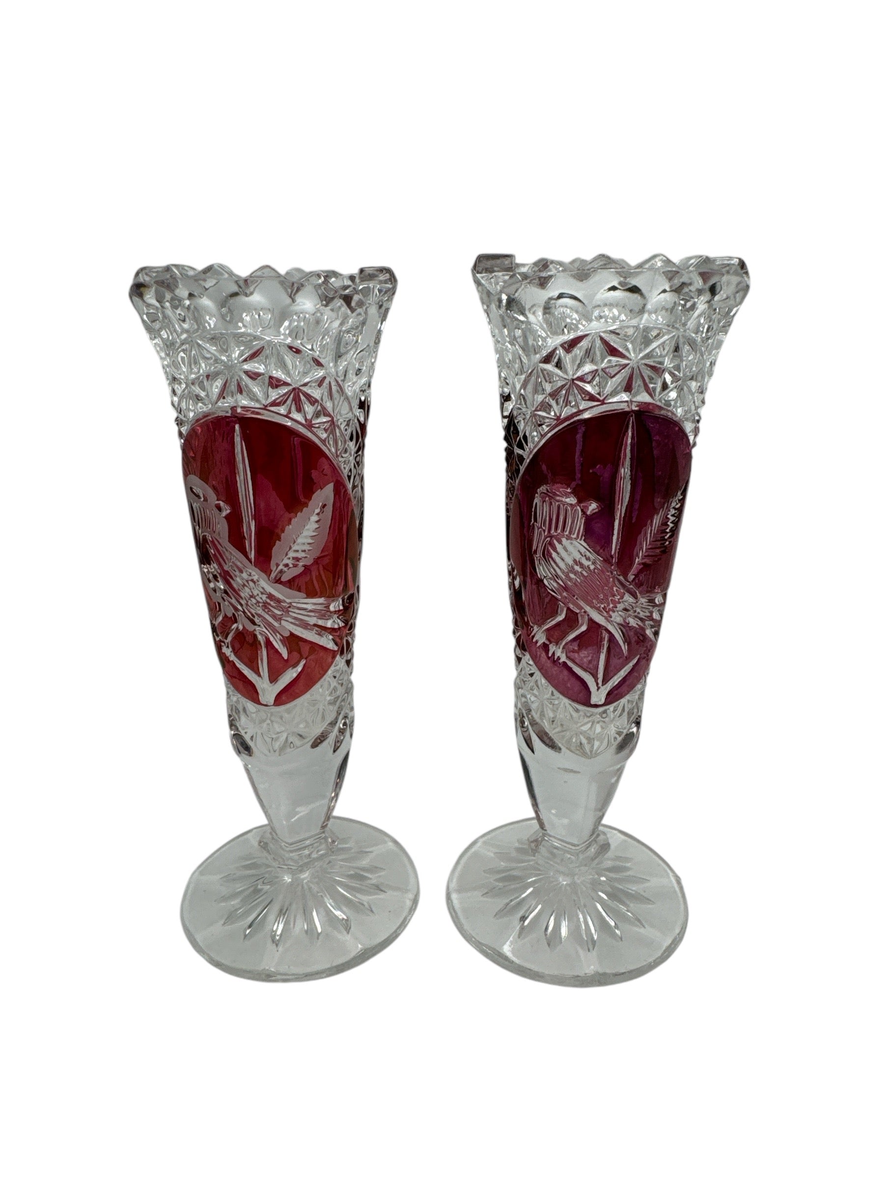 Discover the exquisite beauty of the "Byrdes Collection" with this Amaris Nachtmann Hofbauer crystal bud vase (2). Featuring delicate birds perched on a branch amidst ruby-colored leaves, this vase is a true work of art. Its good used condition ensures that it will be a treasured piece for years to come, measuring 6.5cmL x 6.5cmW x 16.5cmH.