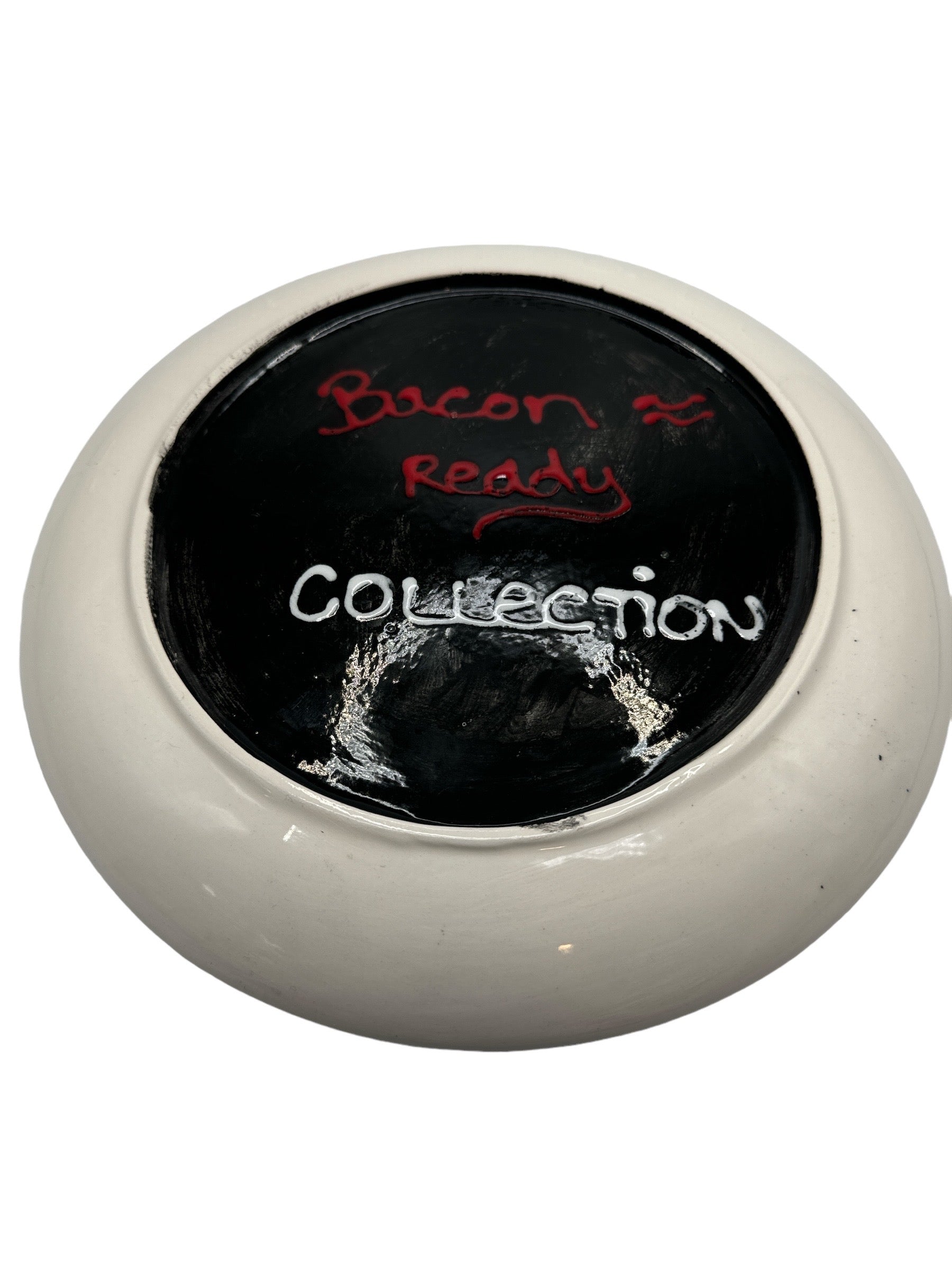 This handcrafted "Bacon" plate features a design of a pig and chick, with the phrase "Babu in my shoe" on the front and "Bacon ready collection I heart Babu" on the back. It is in good used condition with no chips or cracks.