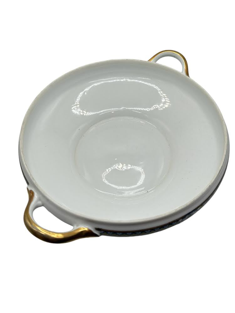 This casserole dish, produced between the years 1911-1935, features a unique gold edge design and two handles. Adorned with elegant floral cameo details in red and yellow, it reflects the geometric art deco style of the era. While still in good condition overall, some of the gold on the edges has worn off due to its age.