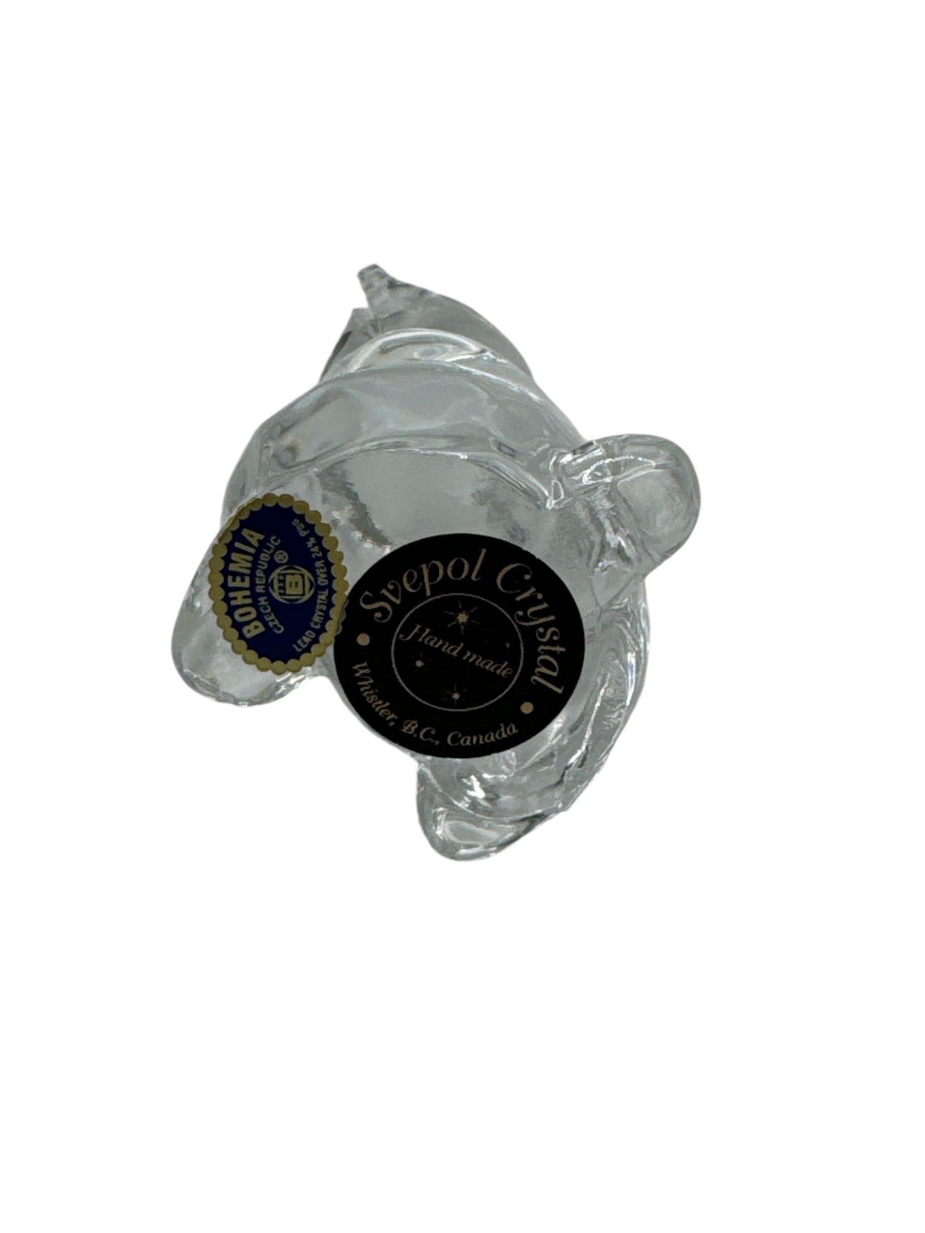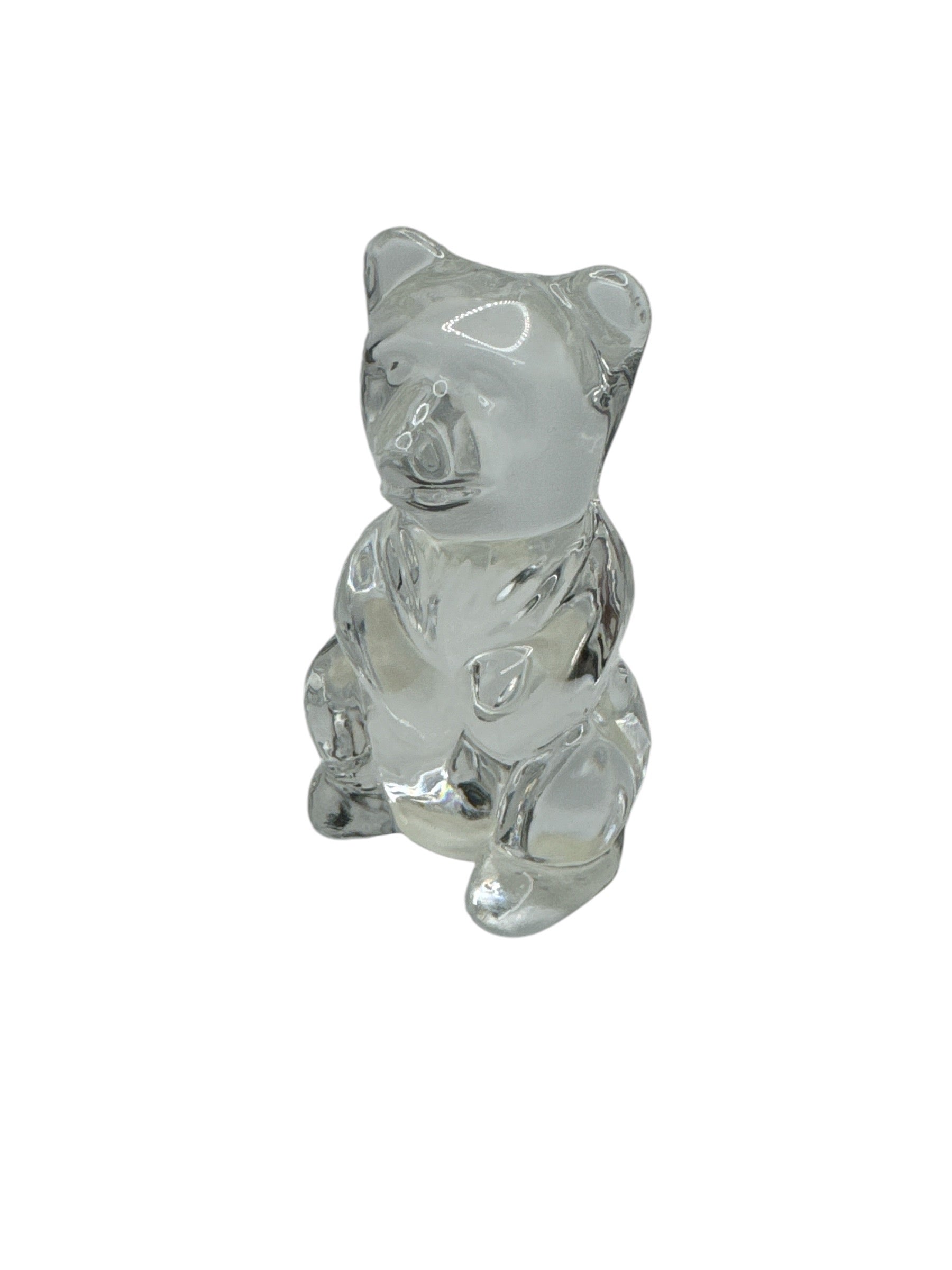 This vintage lead crystal glass bear ornament sparkles with sophistication, boasting over 24% lead content. The original sticker remains, adding to its exclusivity. At 5 cm in length, 5.5 cm in width, and 9 cm in height, this ornament is a luxurious addition to any collection.