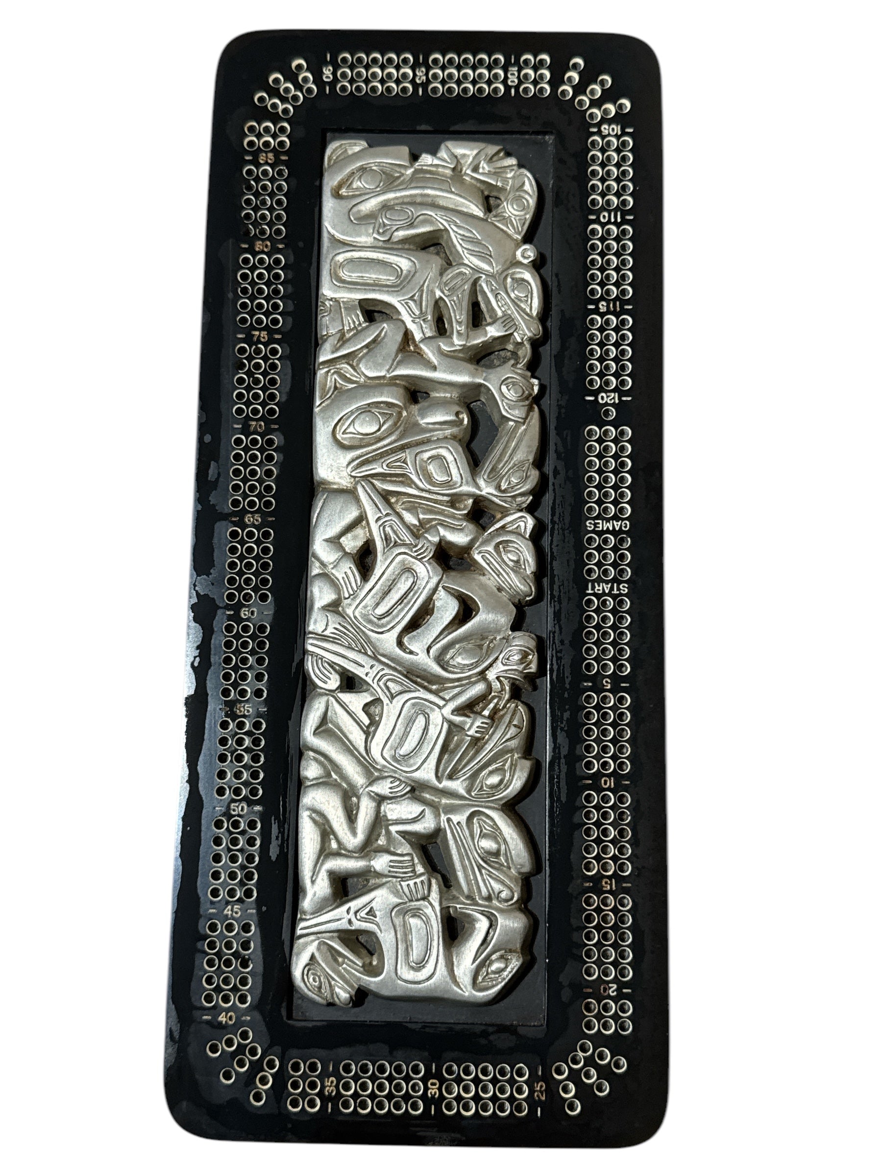 Crafted in Canada, the BOMA Cribbage Board features a Northwest Coast Haida design. The elegant board boasts a black resin inlay with pewter accents, complete with 9 metal pegs discreetly stored in the side. Its overall dimensions are 13cm L x 2.5cm W x 30cm H, and it is in impeccable used condition.