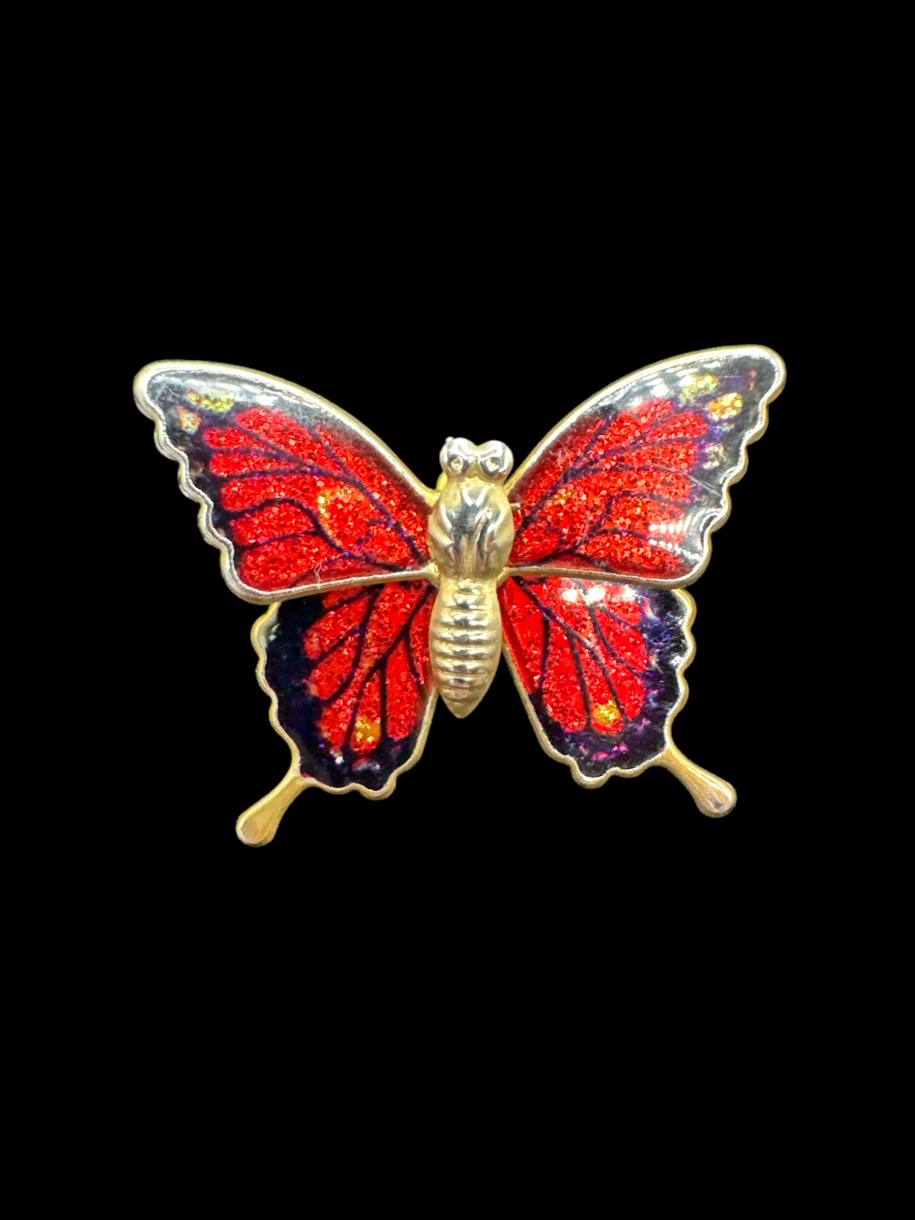 This butterfly brooch, featuring red and black hues and sparkling details, is in good used condition. It was made in Taiwan and does not have a visible maker's mark. With dimensions of 4 cm in length, 0.5 cm in width, and 3.5 cm in height, it is a stylish and unique accessory to add to your collection.