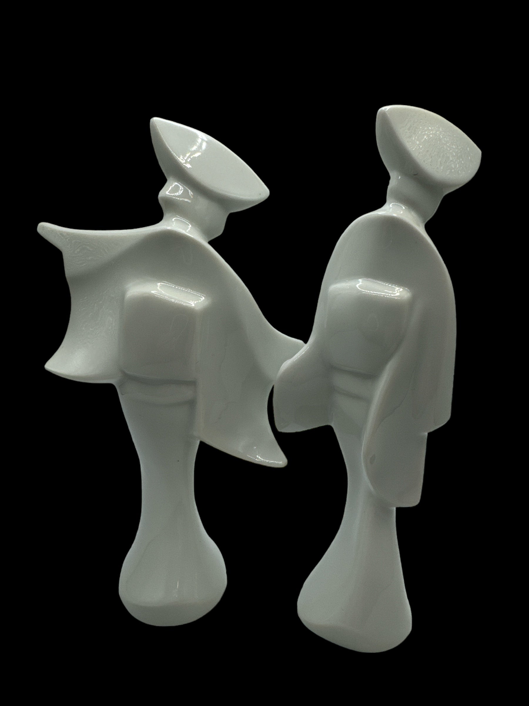 Experience the beauty and elegance of Japan with these vintage dancing geishas, crafted from delicate white porcelain. Perfect for adding a touch of Japanese culture to your home decor.