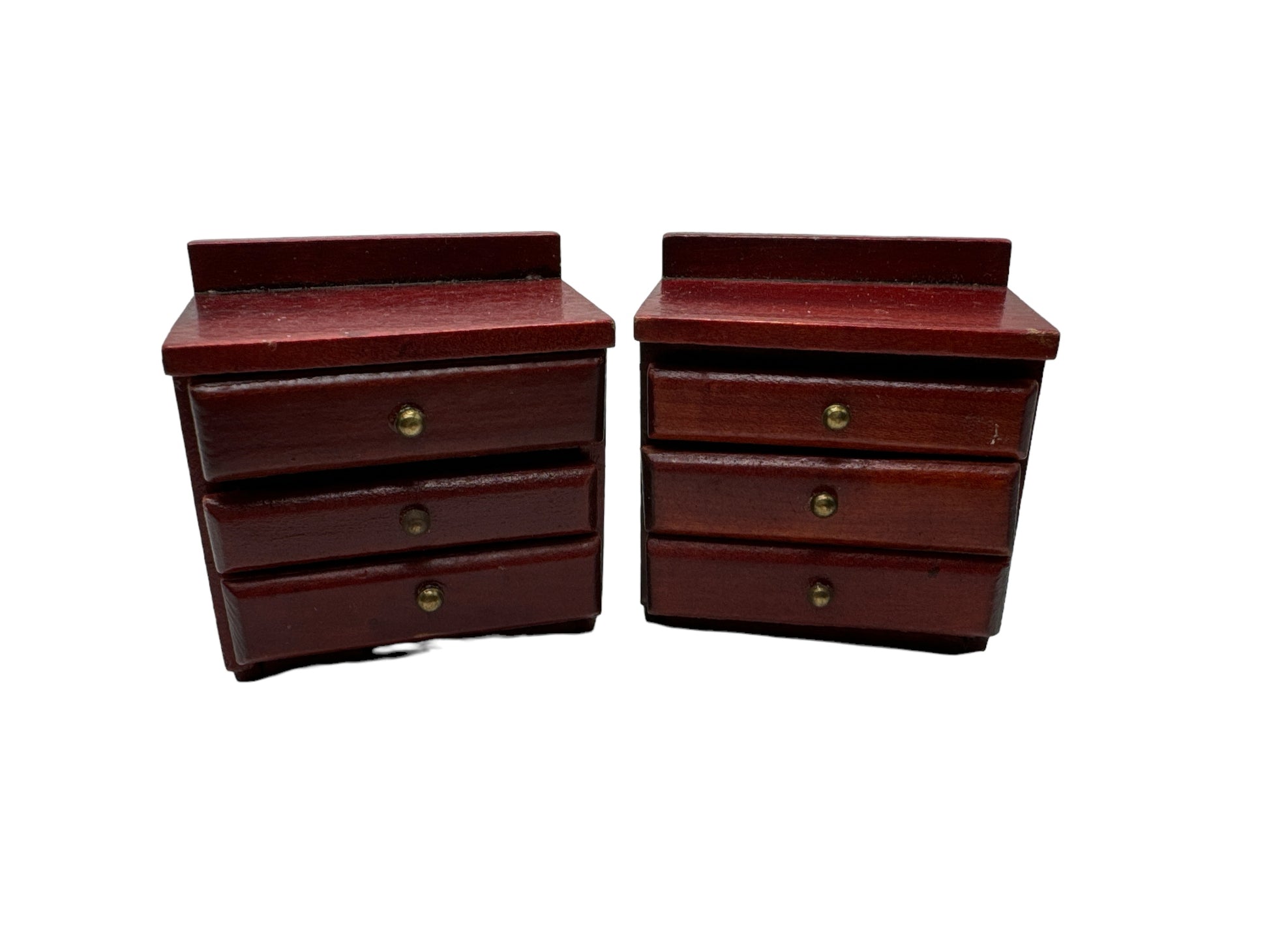 The dimensions of the bedside cabinets are 1:12 scale, measuring 2 inches in length by 3.25 inches in width and standing at 5.5 centimeters in height.