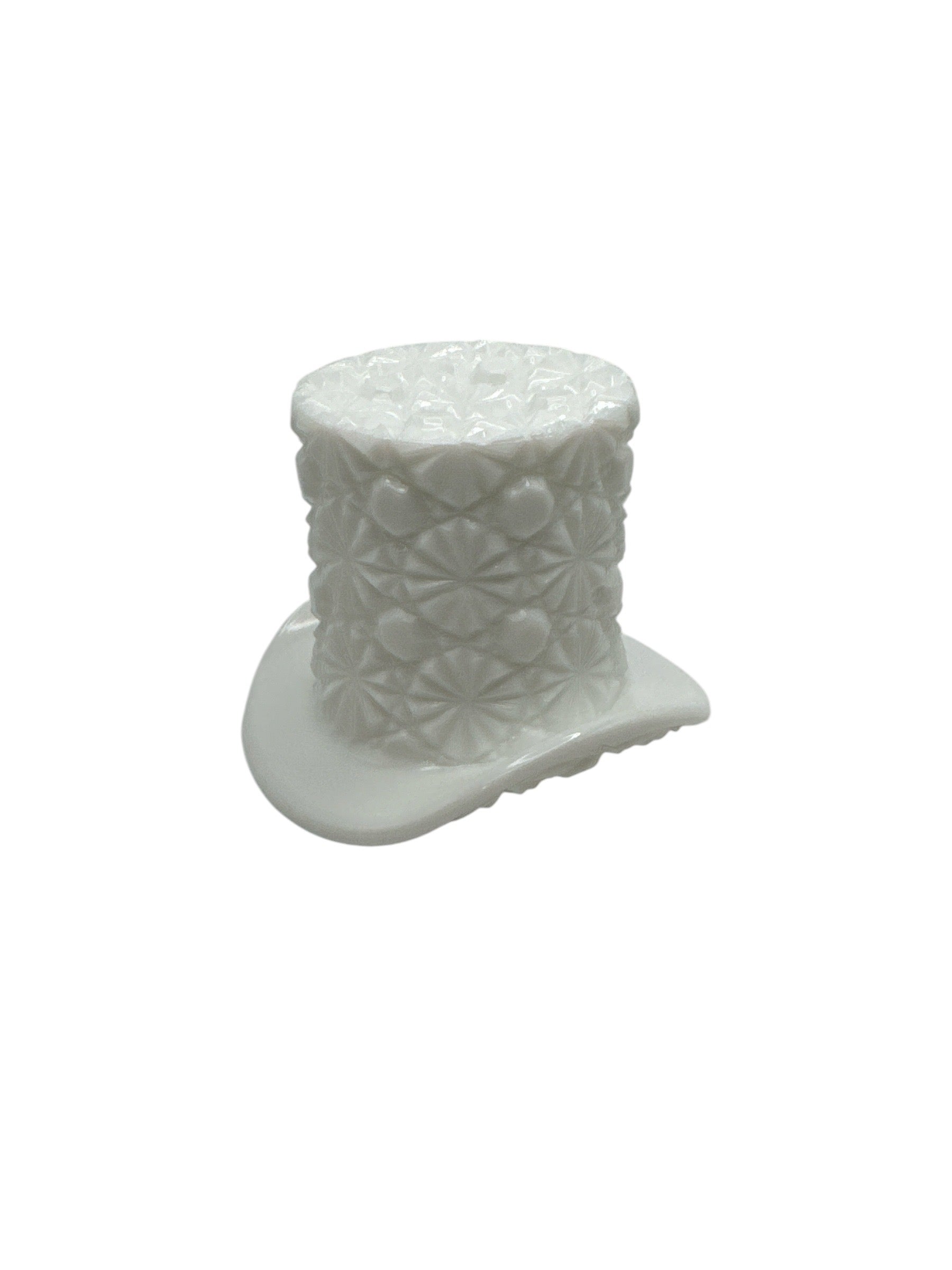 This Fenton Milk Glass Top Hat is a vintage ornament featuring a Button & Daisies design. Measuring 8cm in length, 8cm in width, and 6cm in height, it can be used as a trinket holder or a unique vase. Despite its age (pre-2000), it is still in good condition.