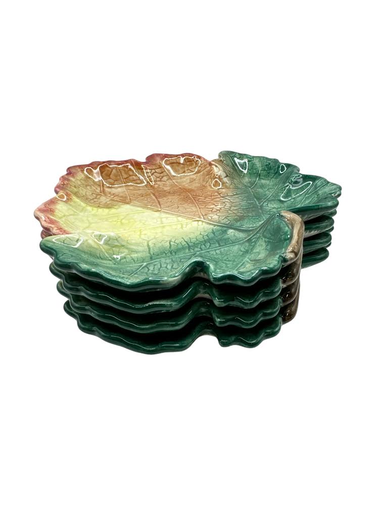 This set includes four leaf-shaped dish plates made of Ironstone material. Overall, the plates are in good used condition, with three in pristine condition and just one having a small chip on the back and top leaf. Each plate measures 18cm in length, 18cm in width, and 2cm in height.
