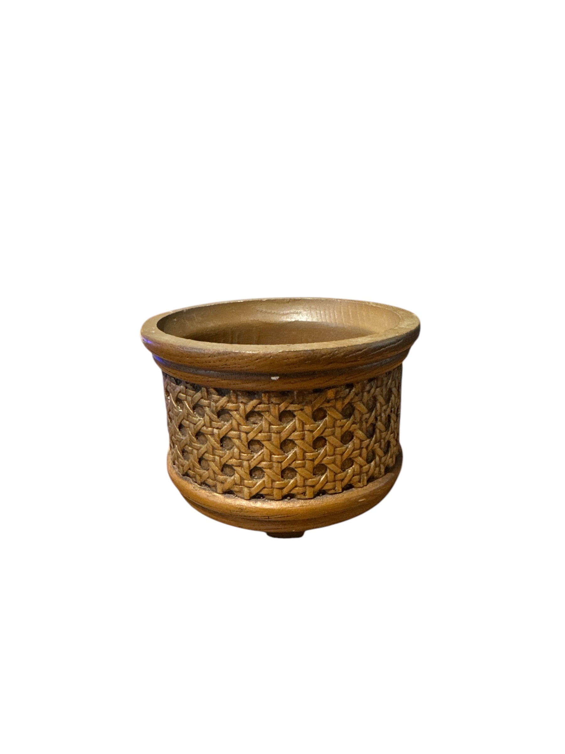 This 13cm (5") vintage gold basketweave plastic planter was designed for FTD and is suitable for indoor use. Despite some signs of use, it remains in good condition. Measuring 13cm L x 13cm W x 9.5cm H, it adds a touch of Hollywood regency and bohemian flair to any space.