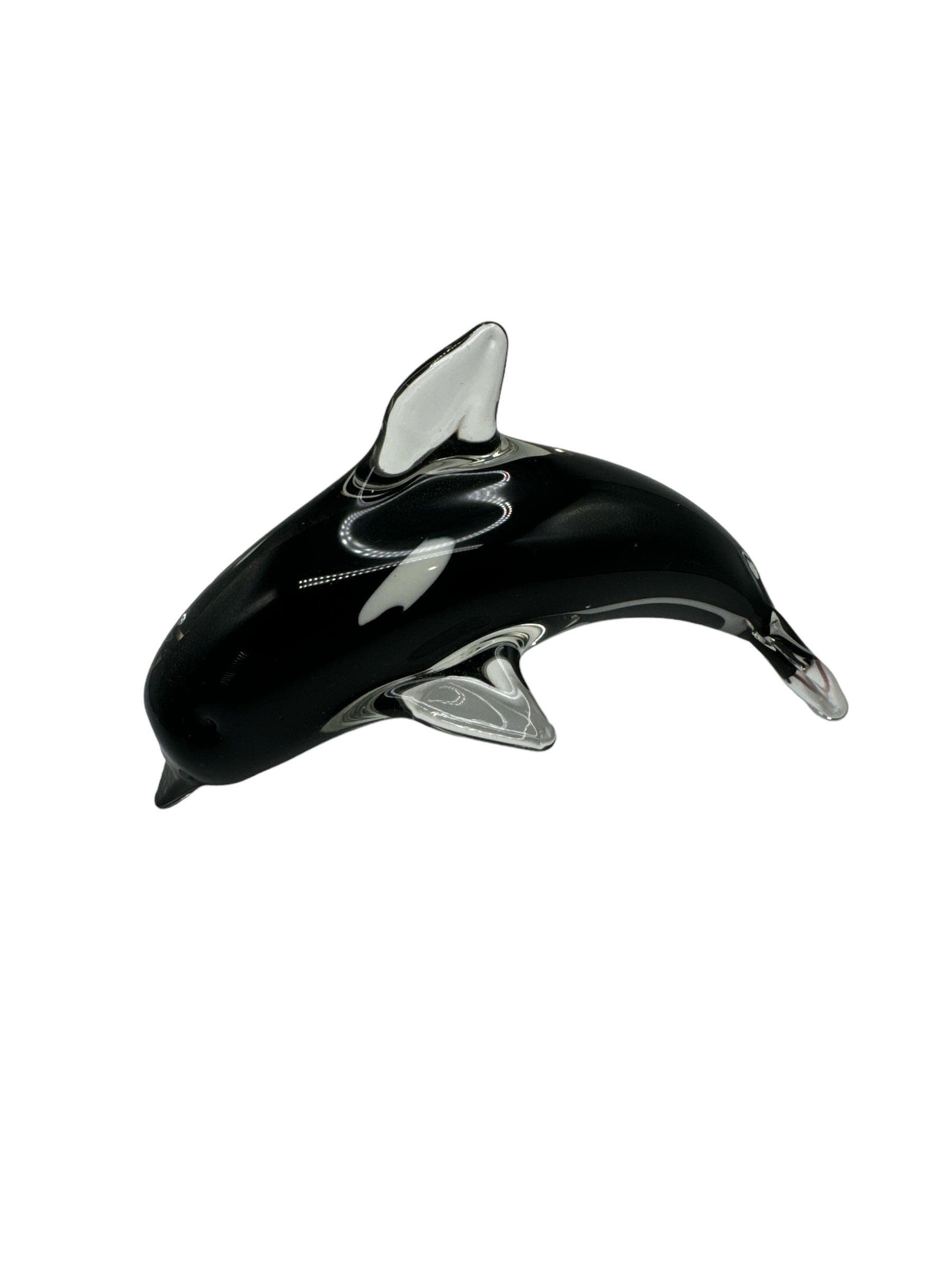 Sleek and timeless, this exquisite Glass Dolphin Paperweight features a striking combination of black, white, and transparent glass. Its flawless condition is a testament to the impeccable craftsmanship, with no visible chips or cracks.