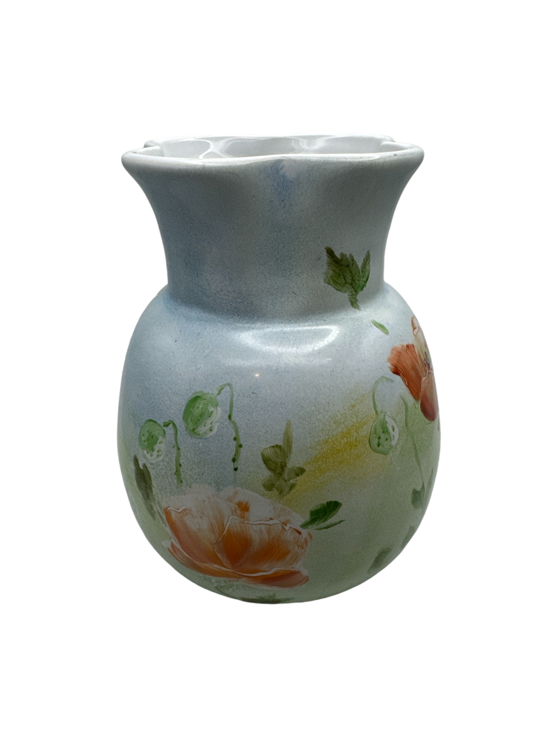 An exquisite hand-painted vase featuring vibrant orange and red poppies against a striking blue and white backdrop. The scalloped rim adds a touch of elegance, while the artist's signature remains a mystery. In excellent used condition with no chips or cracks. Measures 11.5cm in length, 11.5cm in width, and 16.5cm in height.