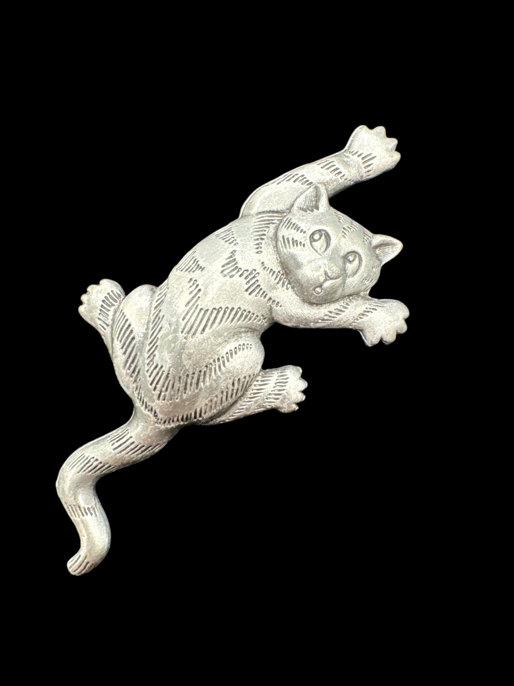 This vintage 1988 cat brooch is made of high-quality pewter and manufactured in the USA. Measuring 3.5 cm in length and .5 cm in width, it adds a stylish touch to any outfit.