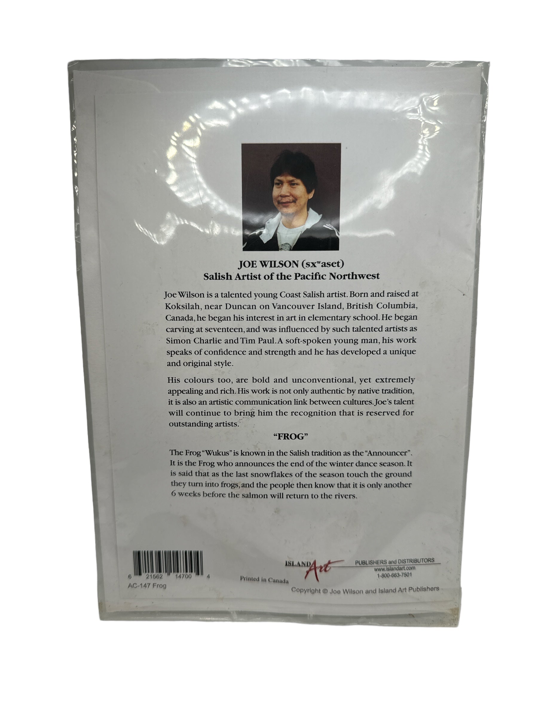 Discover the captivating work of Joe Wilson, a Salish artist hailing from the Pacific Northwest. These unique frog art cards are a stunning addition to any collection, reflecting the beauty and depth of First Nations art and culture.