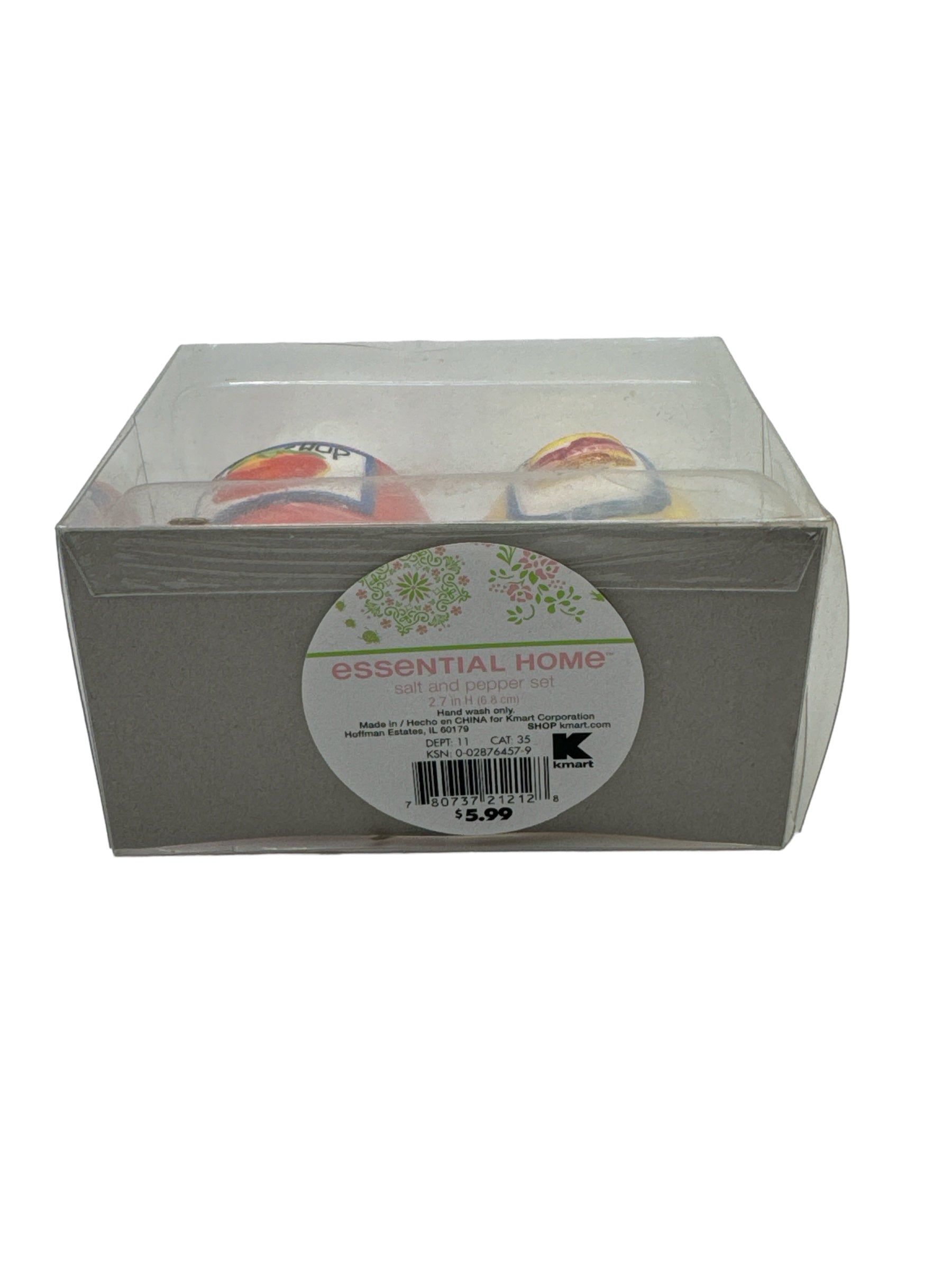 In its original packaging, these salt and pepper shakers stand at a playful height of 6.8 cm.