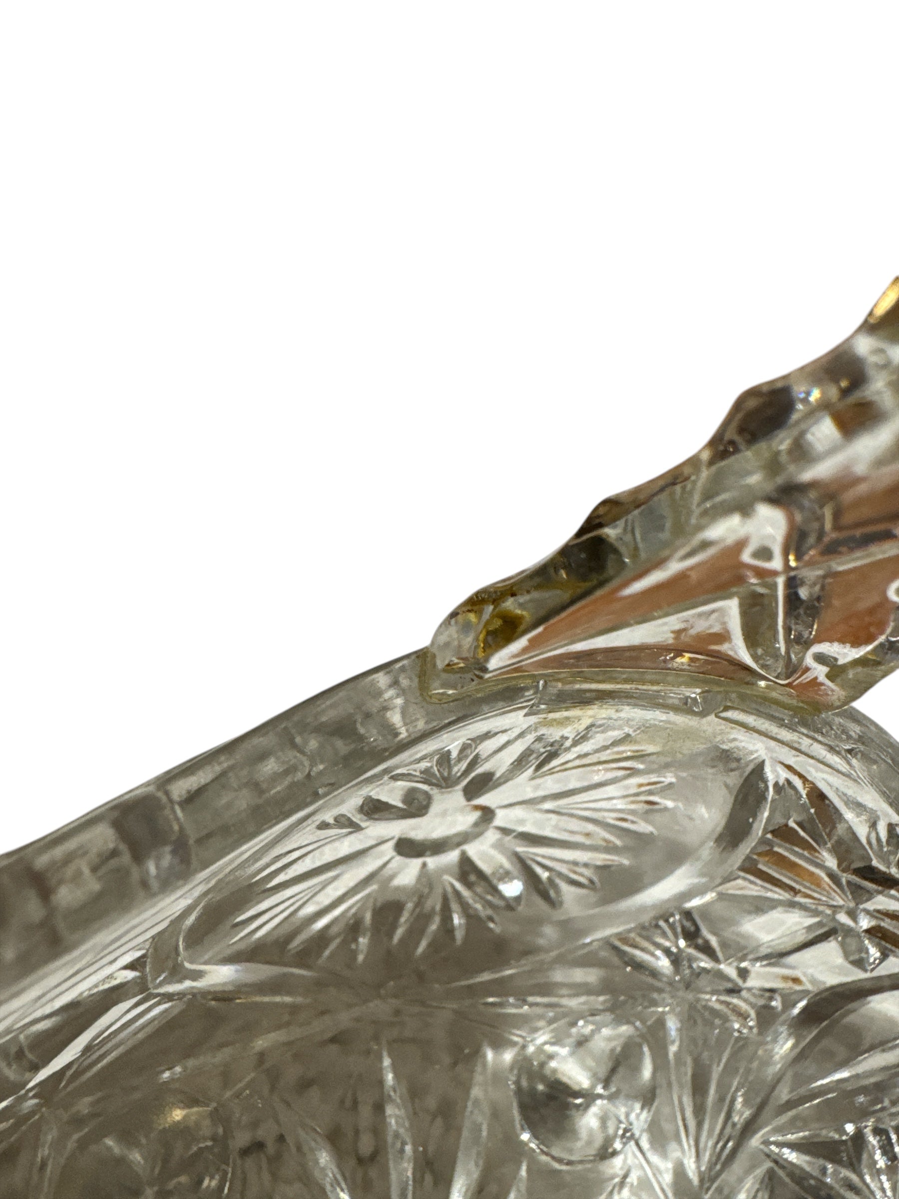 This lead crystal flower basket is in great pre-owned condition, with only minor flaws of two small chips on the basket's edge and handle. These imperfections measure just 1 centimeter each. The basket has dimensions of 13cm in length, 9cm in width, and stands at a height of 14cm.