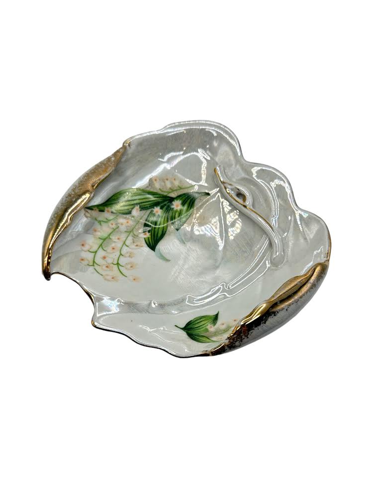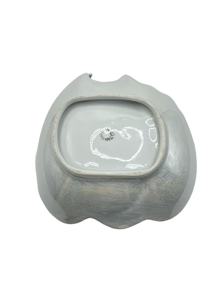 This vintage Japanese trinket dish is perfect for storing pickles or other small items. Despite some minor wear on the gold edges, it is in good used condition with no chips or cracks. It measures 14cm in length, 14.5cm in width, and 4cm in height.