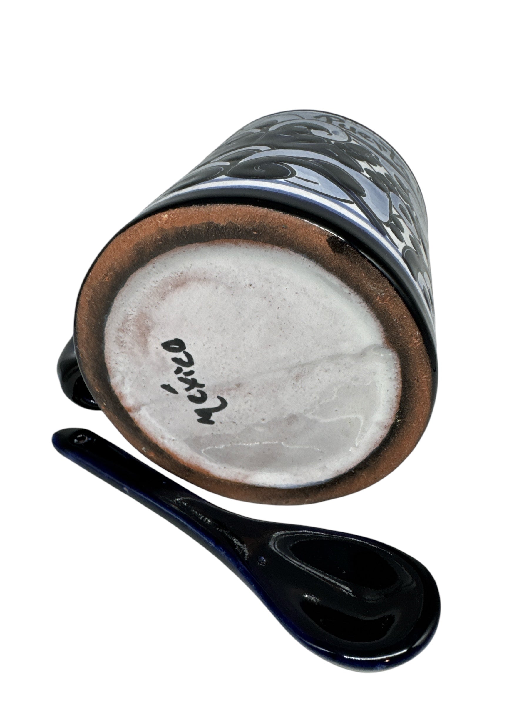 Indulge in the exquisite artistry of this meticulously hand painted Mexican talavera mug featuring a unique spoon incorporated into its elegant handle. Sourced from the charming city of Puerto Vallarta, this marvelously crafted piece is in pristine condition with no imperfections. Holds 16 fluid ounces of your favorite beverage.