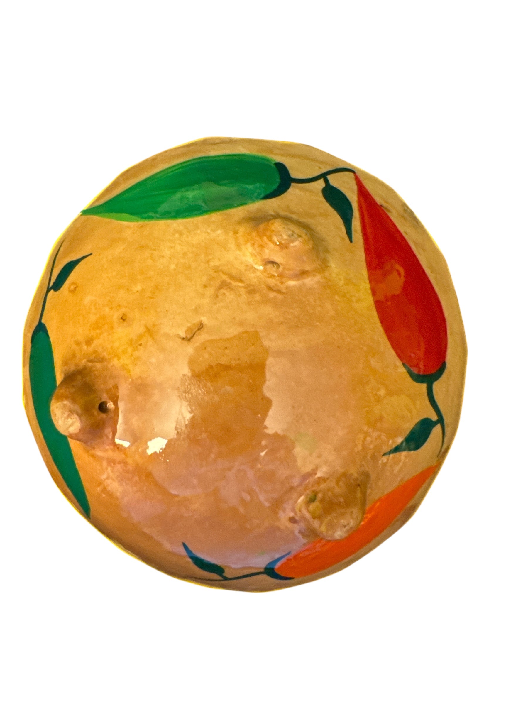 This elegant bowl showcases vibrant red, green, and orange chili peppers. It remains free of any blemishes, measuring 14cm in both length and width, with a height of 4.5cm.
