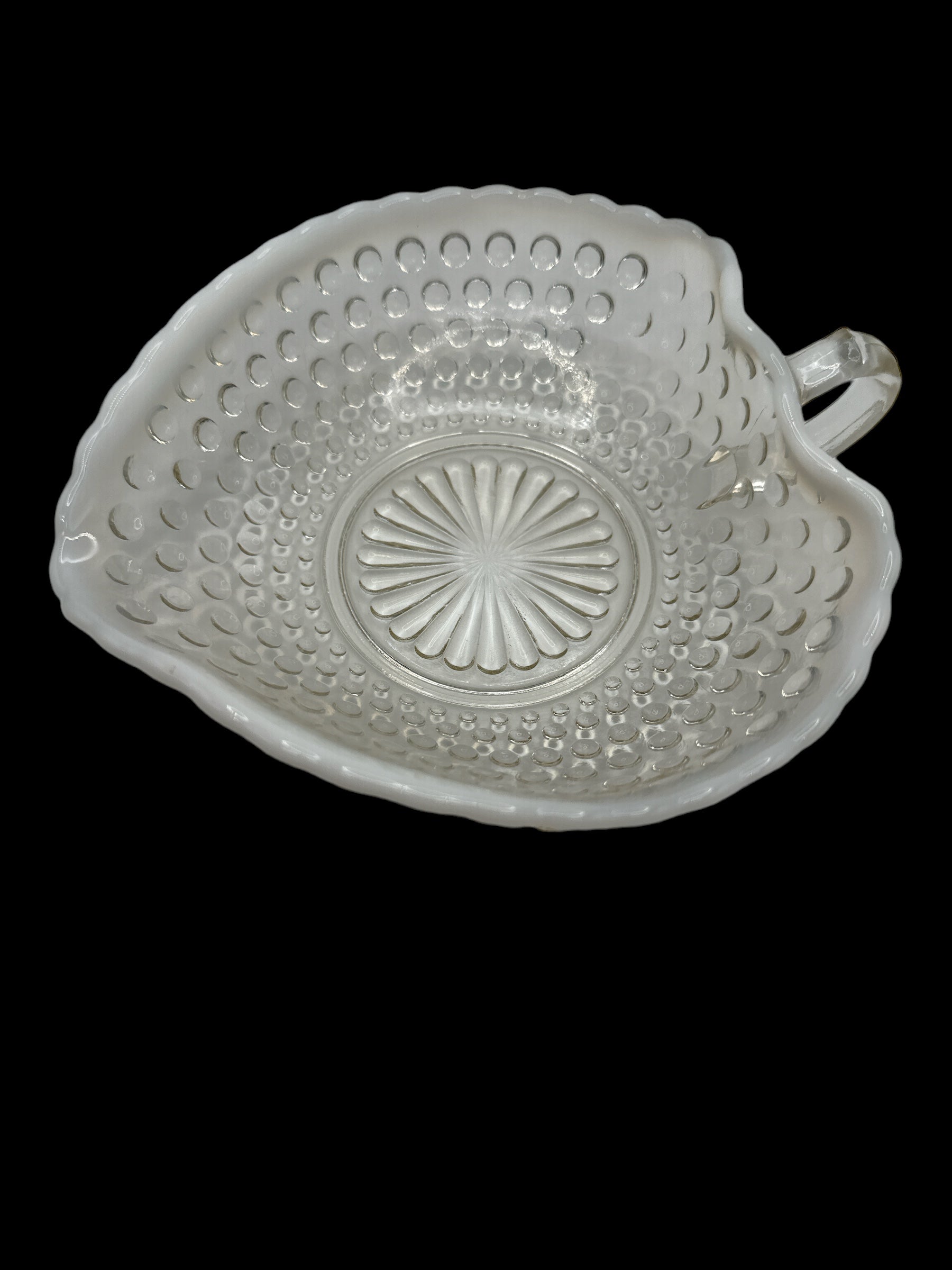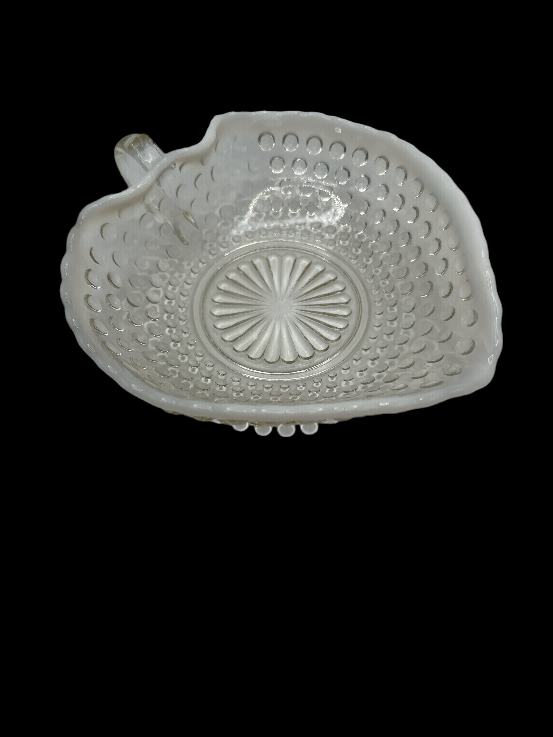 Introducing the stunning Moonstone Anchor Hocking Dish, featuring a breathtaking leaf-like design and opalescent finish. Measuring 16 cm L x 17.5 cm W x 5 cm H, this dish is in pristine condition with no chips or cracks. Experience the beauty and elegance of this one-of-a-kind piece for yourself!