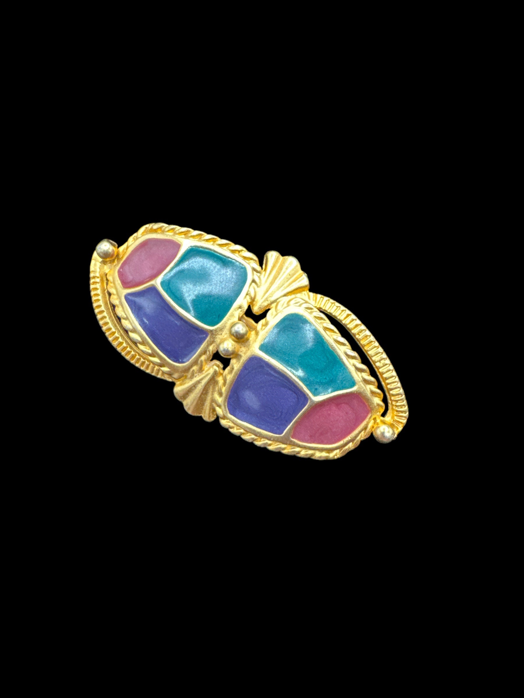 Discover the magic of the stunning Mosaic Brooch with its rich gold tones, unique design, and intriguing history. This one-of-a-kind piece has no maker's marks, adding to its allure and mystery. At 5.25 cm length, 1 cm width, and 2.75 cm height, it is perfect to add a touch of elegance to any outfit. Don't miss out on this remarkable find in used condition!