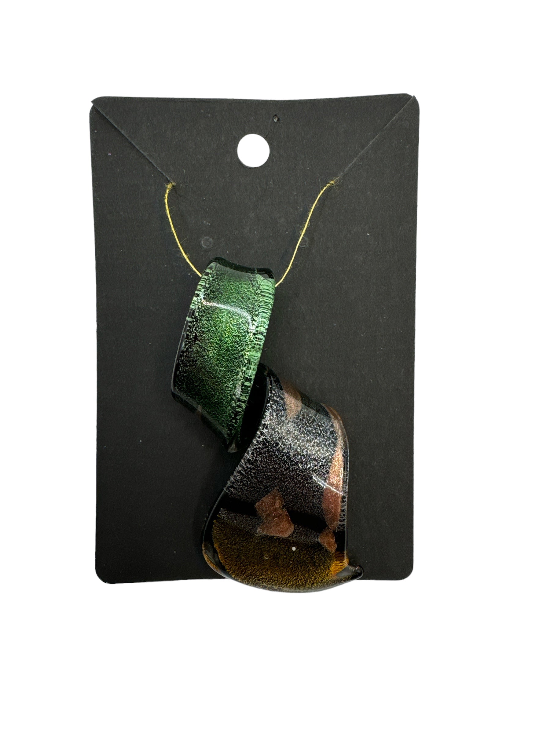 This exquisite pendant features a mesmerizing blend of vibrant green, radiant yellow, and shimmering gold flakes. Each one is meticulously handcrafted and comes packaged in pristine condition. Measuring at 3 cm in length, 1.5 cm in width, and 8 cm in height, this pendant is a true work of art that will add a touch of elegance to any outfit.