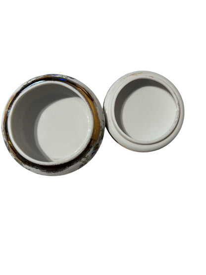 This powder jar features elegant hand-painted violets and gold edges, with a charming depiction of a Mother atop the lid. It is in excellent used condition, free of any chips or cracks. The bottom is marked with the Saji China Co. brand from Nagoya, Japan. Measuring 10cm in length, 10cm in width, and 5.5cm in height, it is a beautifully crafted and durable addition to any collection.