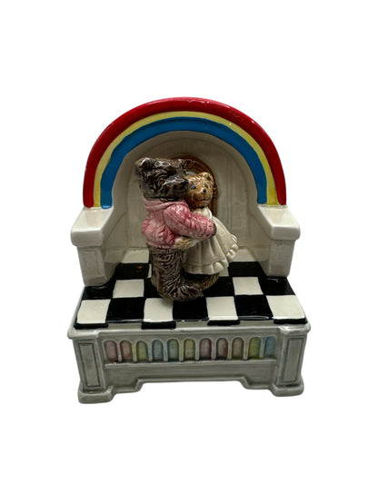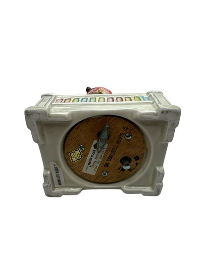 This Otagiri Music Box is expertly crafted in Japan and plays the classic tune "Let Me Be Your Teddy Bear". It measures 10.5cm in length, 8.25cm in width, and 12cm in height. Although there is a small spot of missing paint, it adds character due to its age.