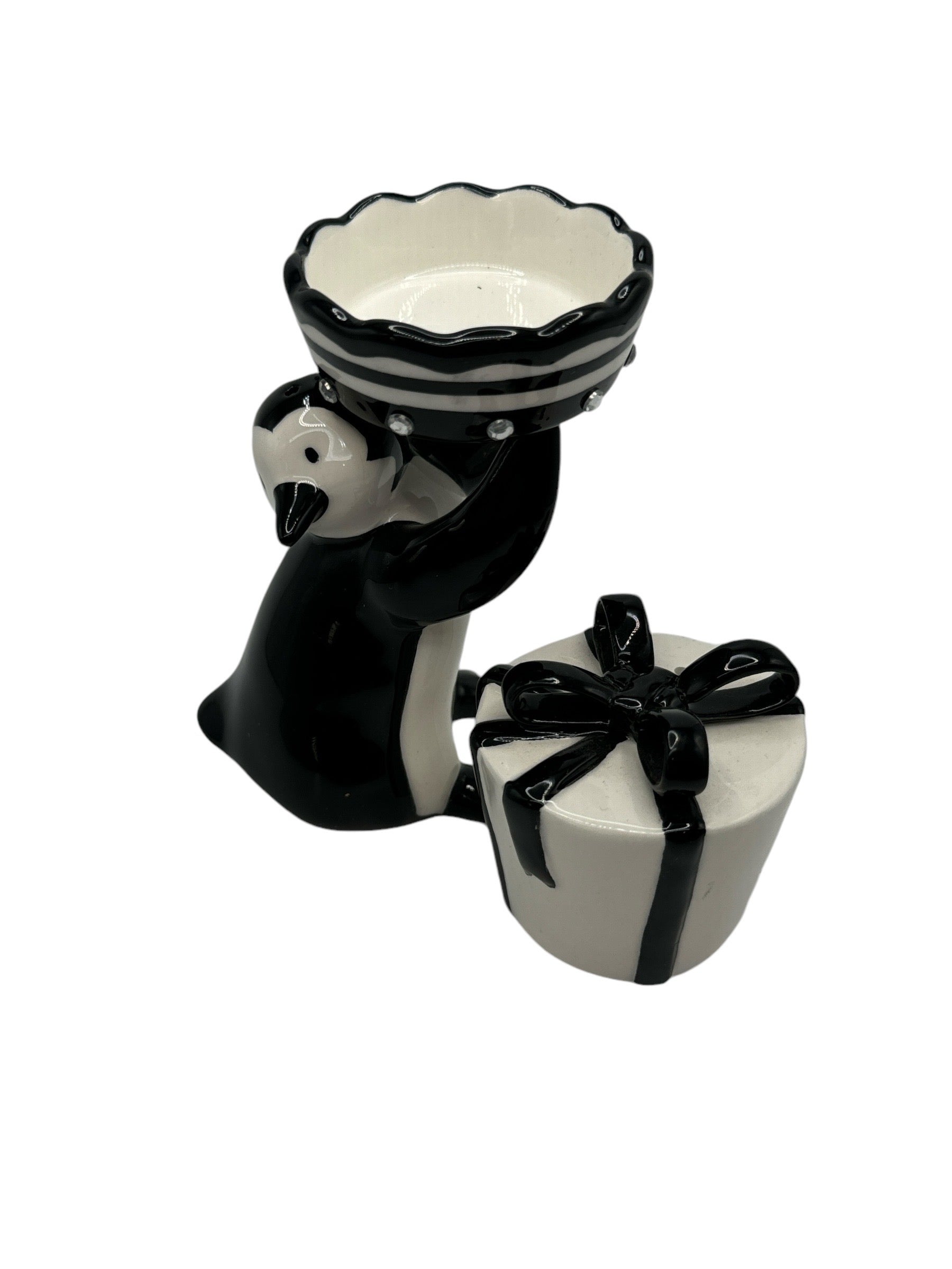 This set of salt and pepper shakers features a black and white penguin holding a gift. Made of ceramic and measuring 14 cm in height, these shakers are in good used condition.
