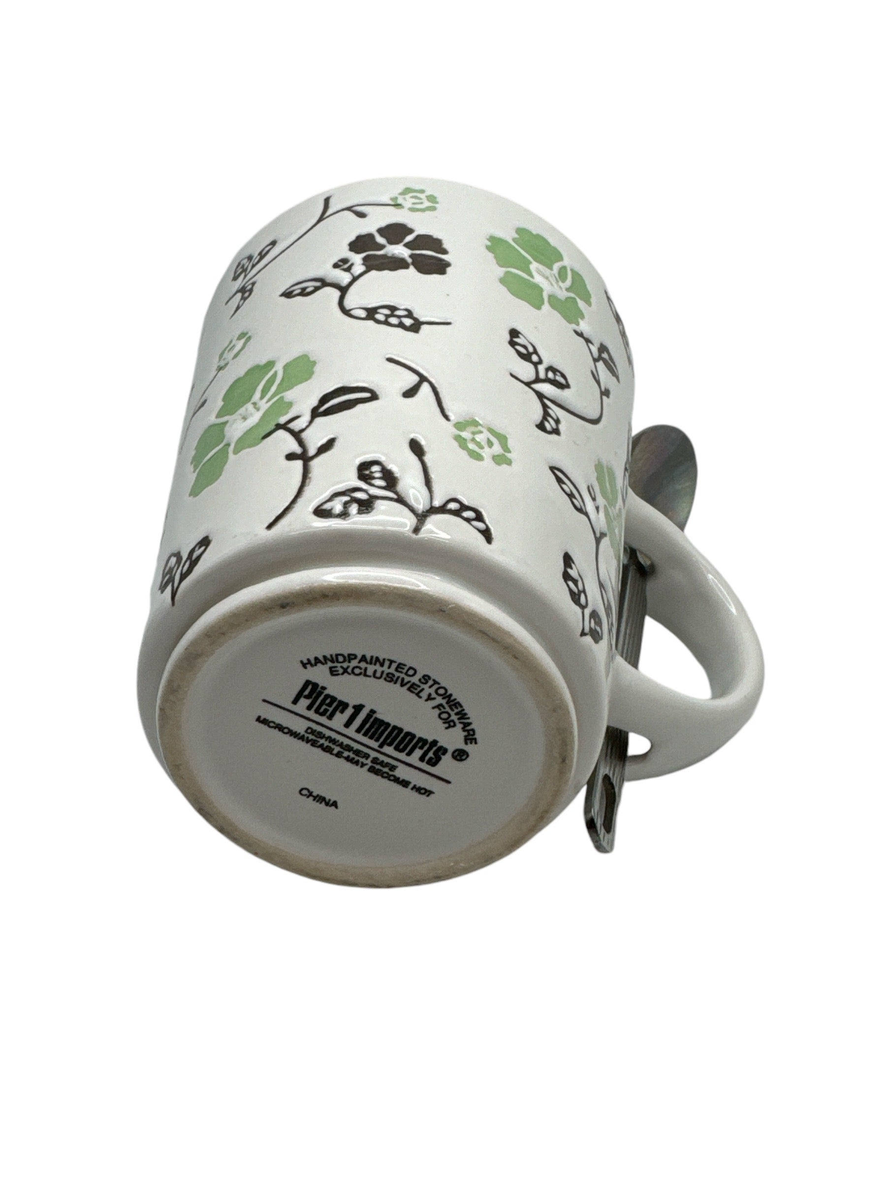 The outer design features a white background with green and brown flowers, while the inside of the mug is also a vibrant green. Attached to the handle is a sleek silver spoon. The product is in good used condition.