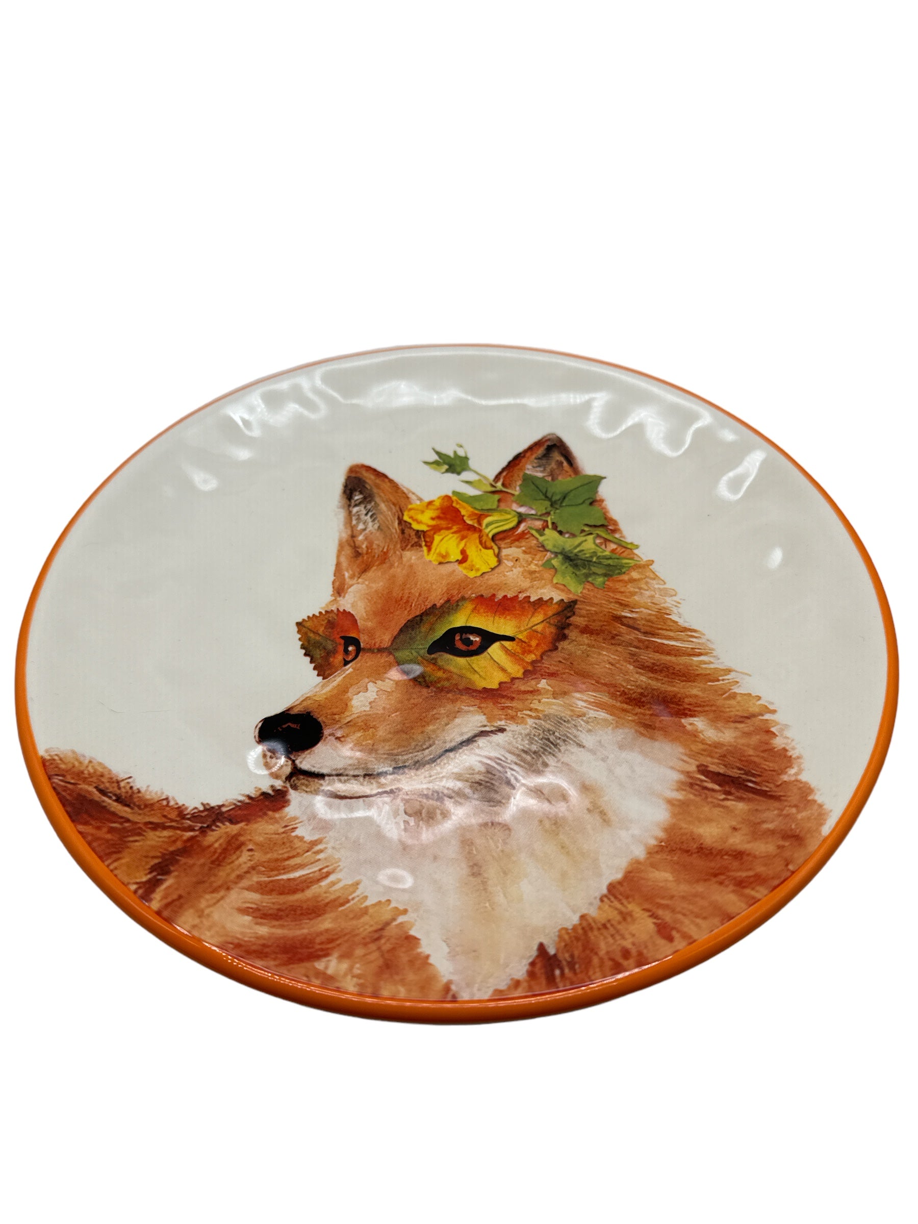 Presenting the Piers Harvest Garden Critters Plate, featuring hand-painted dolomite designs of four adorable critters - a hedgehog, deer, fox, and owl. Please note that although the owl plate has a small chip along the side, the set is still a charming addition to any table setting. Set of four plates.