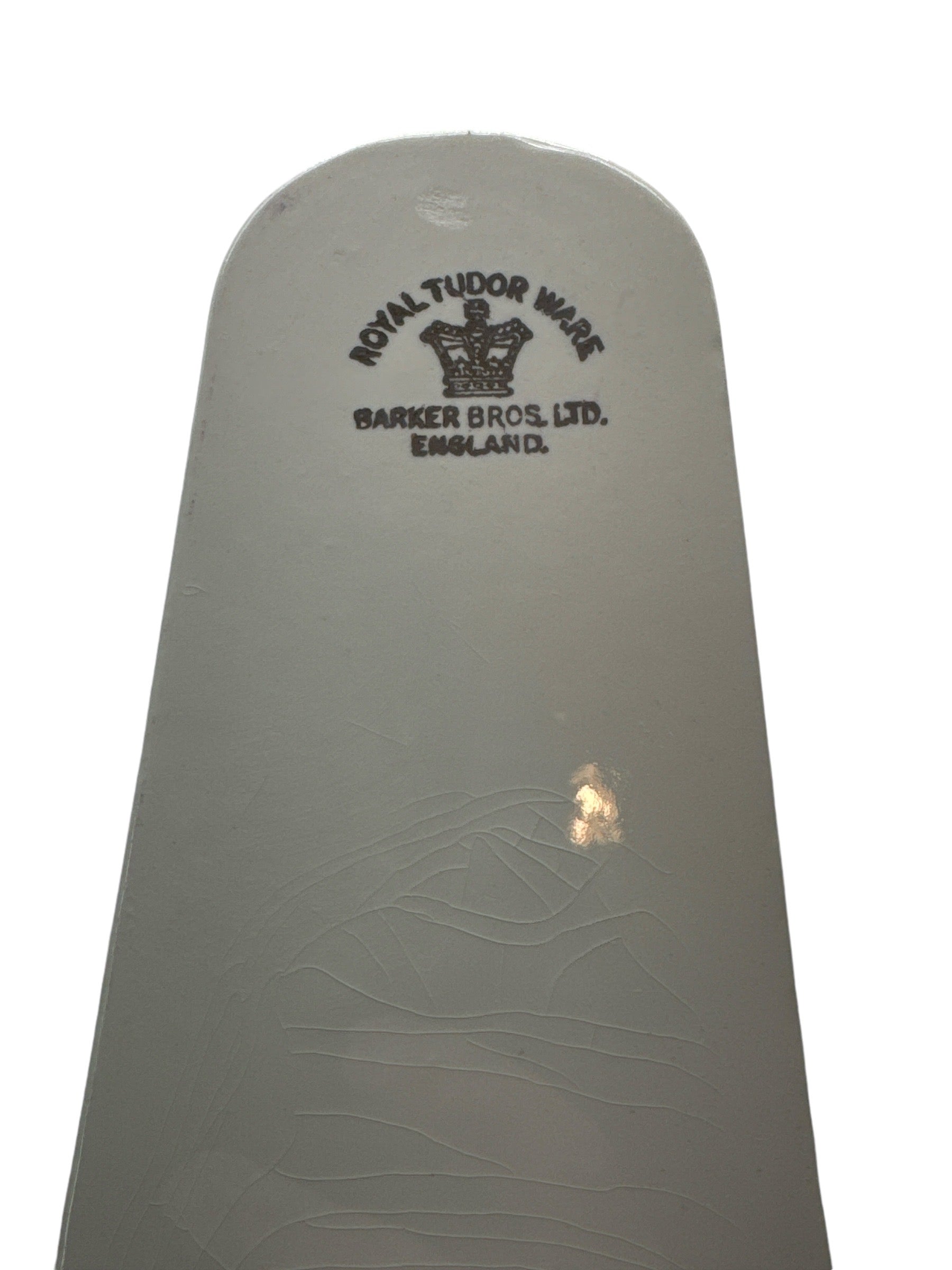 The Royal Tudor Ware Cake Server, created by Barker Bros Ltd in England, features a single large rose design. Despite its age, it remains in good used condition with slight signs of crazing.
