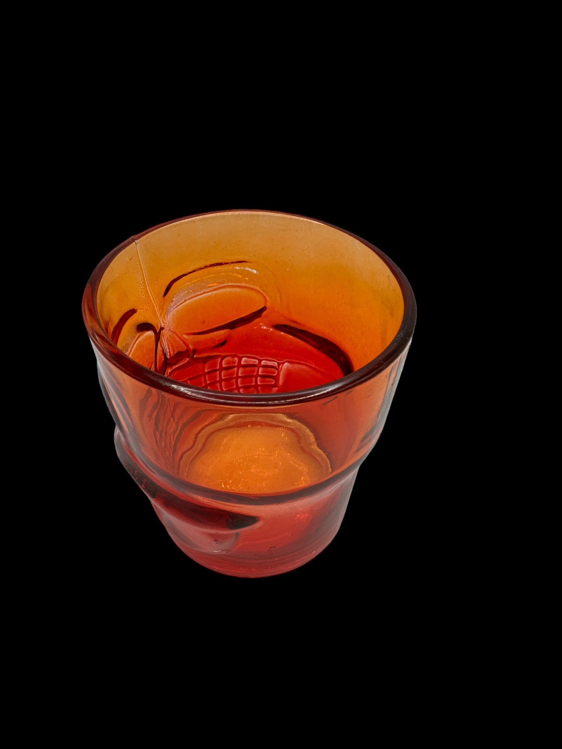 Experience the vibrant colors of this high ball sized drinking cup in red/orange! Embrace the unique and well-loved condition of this glass as you take a sip.