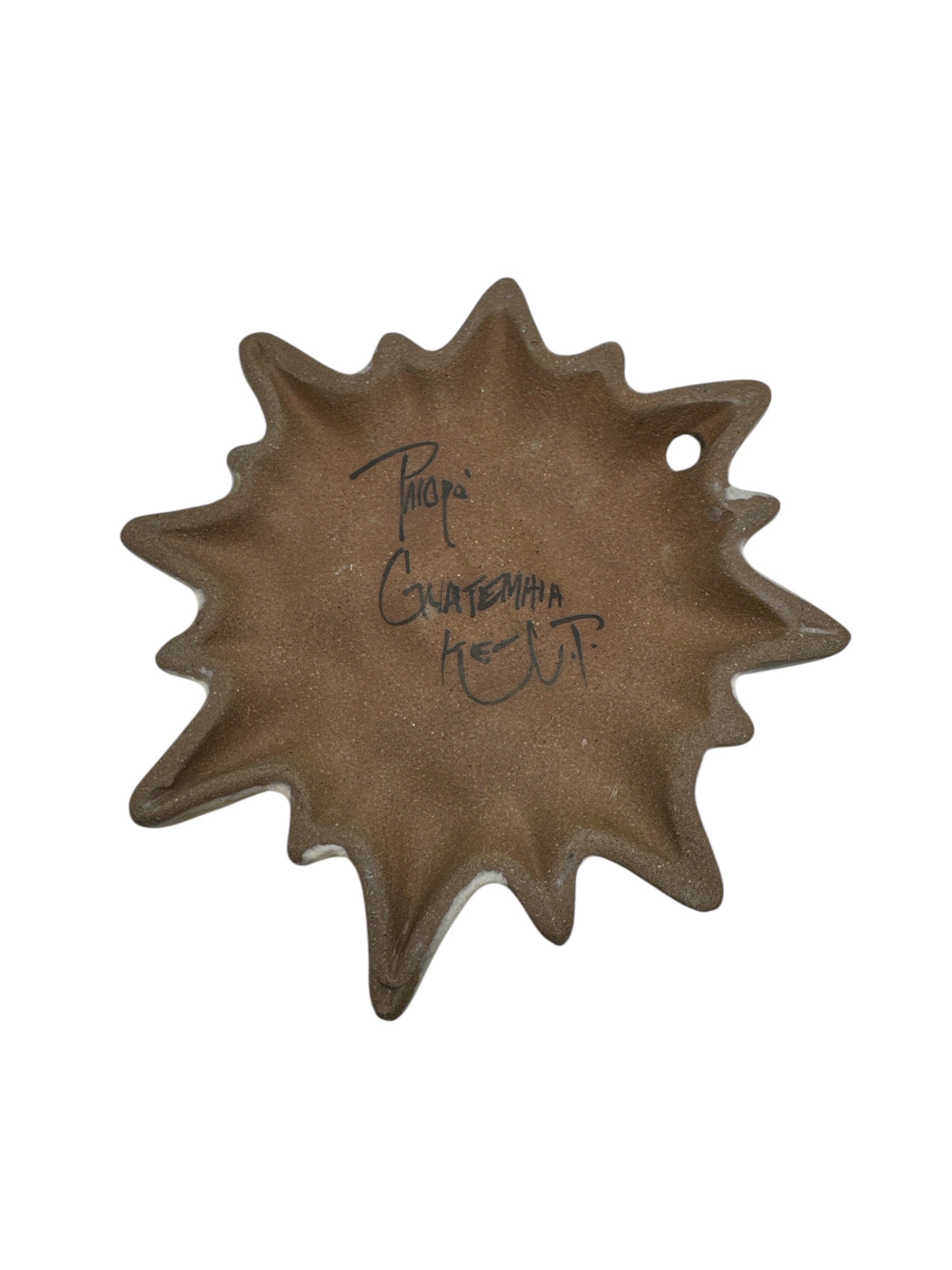 Expertly crafted by Ken Edwards in Palopo, Guatemala, these Sun and Moon pottery wall hangings are in excellent used condition with no chips or cracks, although some slight crazing may be present. The Sun measures 15.5cm in length, 2cm in width, and 16cm in height, while the Moon measures 21cm in length, 2.5cm in width, and 27cm in height.