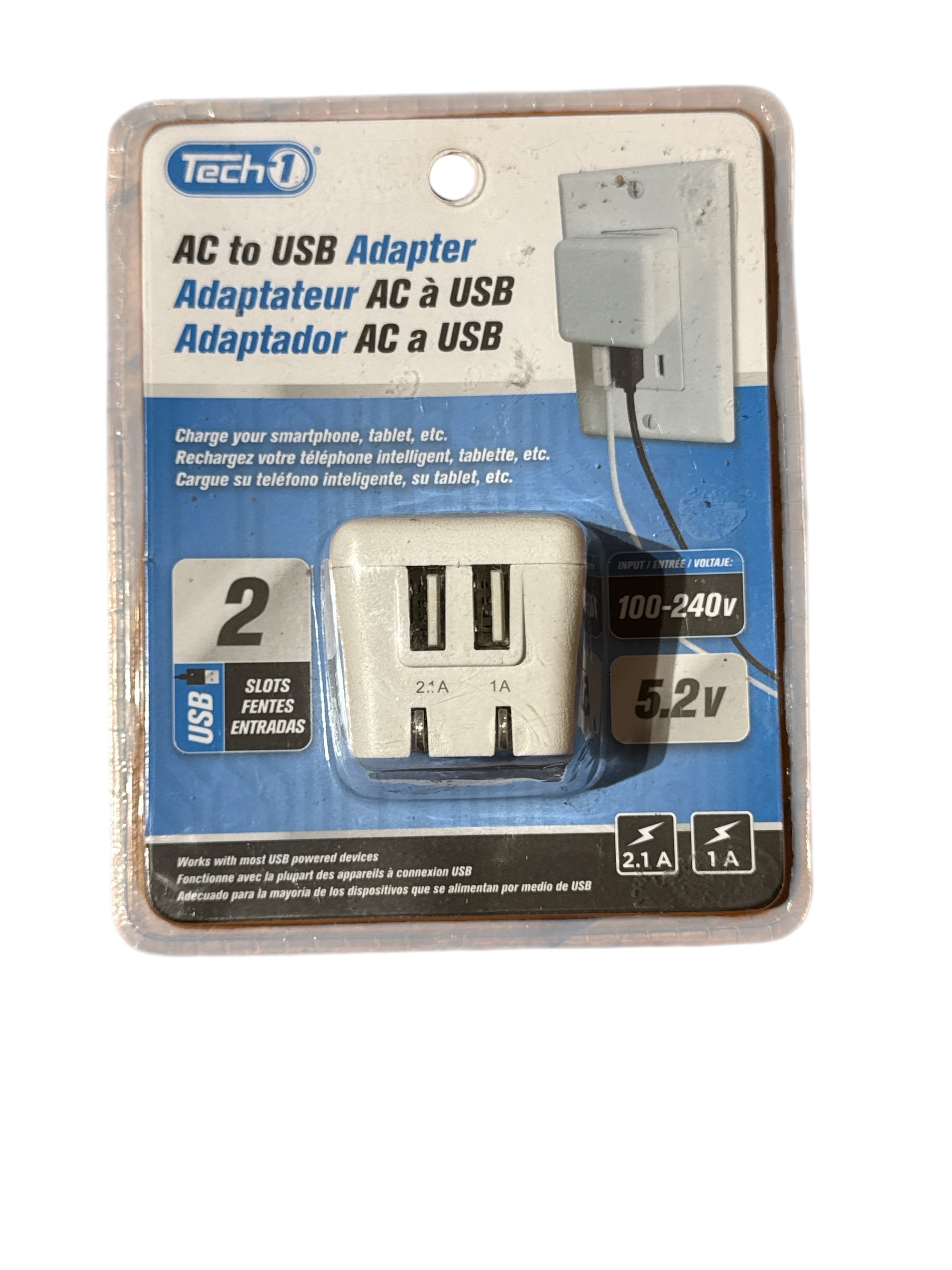 This adapter allows you to charge devices such as smartphones and tablets with its 2 slots, suitable for 100-240V power outlets. It is a brand new item, still sealed in its original packaging.