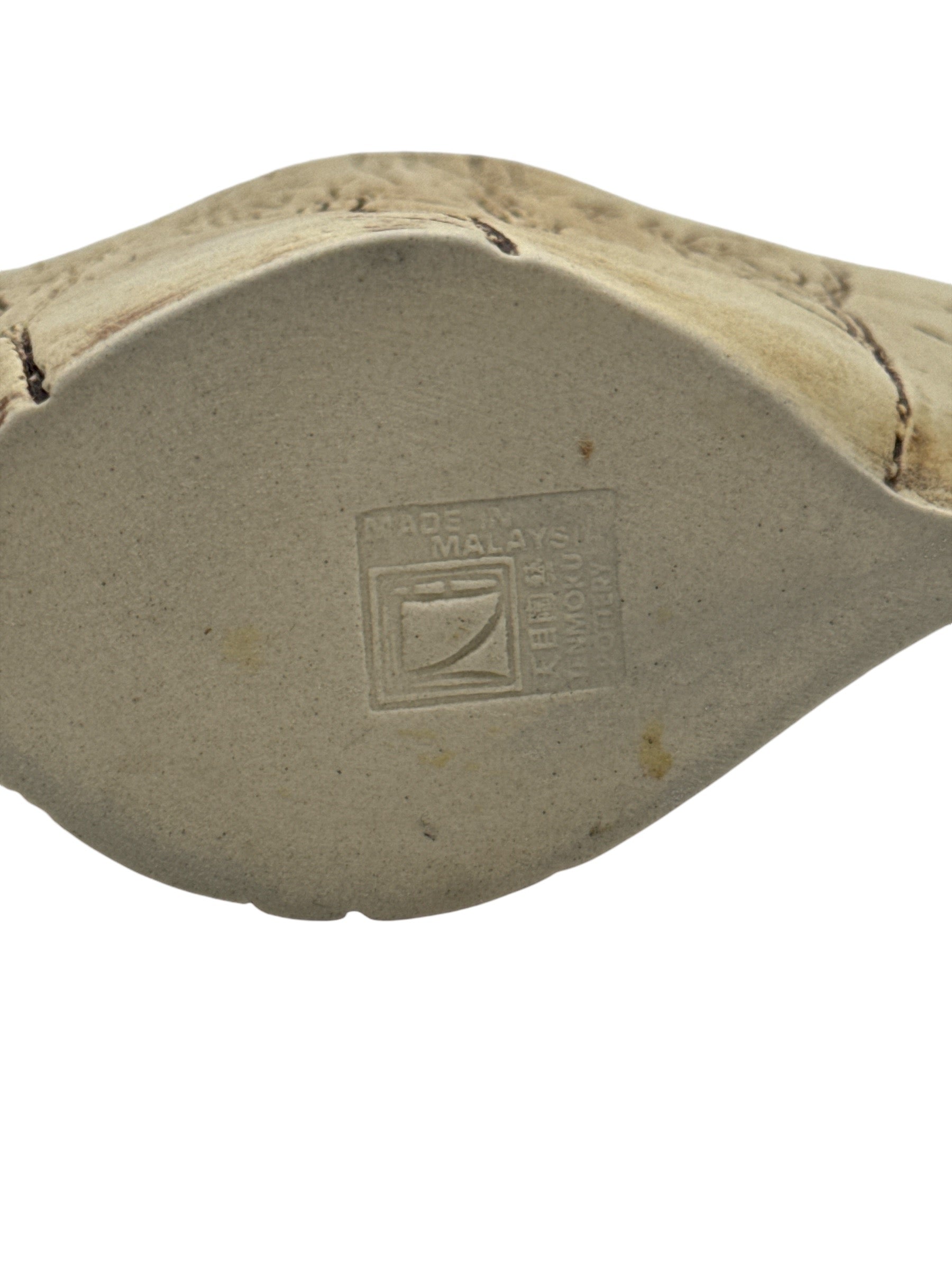 This elegantly crafted ceramic vase, produced in Malaysia, features a refined beige color adorned with intricate brown tree designs. The bottom of the vase bears the unique mark of the master potter who created it.