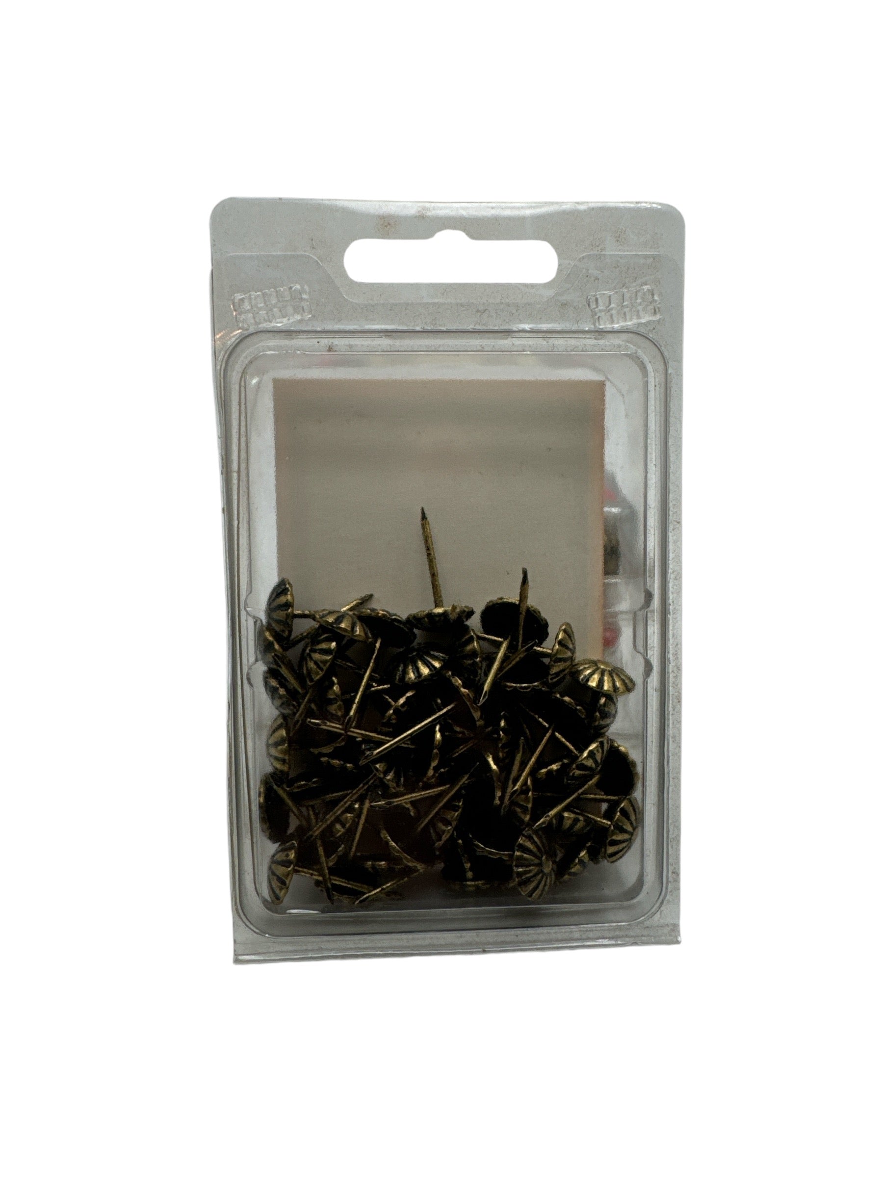 Discover the luxurious world of upholstery with our 4 boxes of tacks, including 2 boxes of 50 exquisite hammered tacks and 2 boxes of 50 elegant daisy tacks, all sealed in unopened packages.