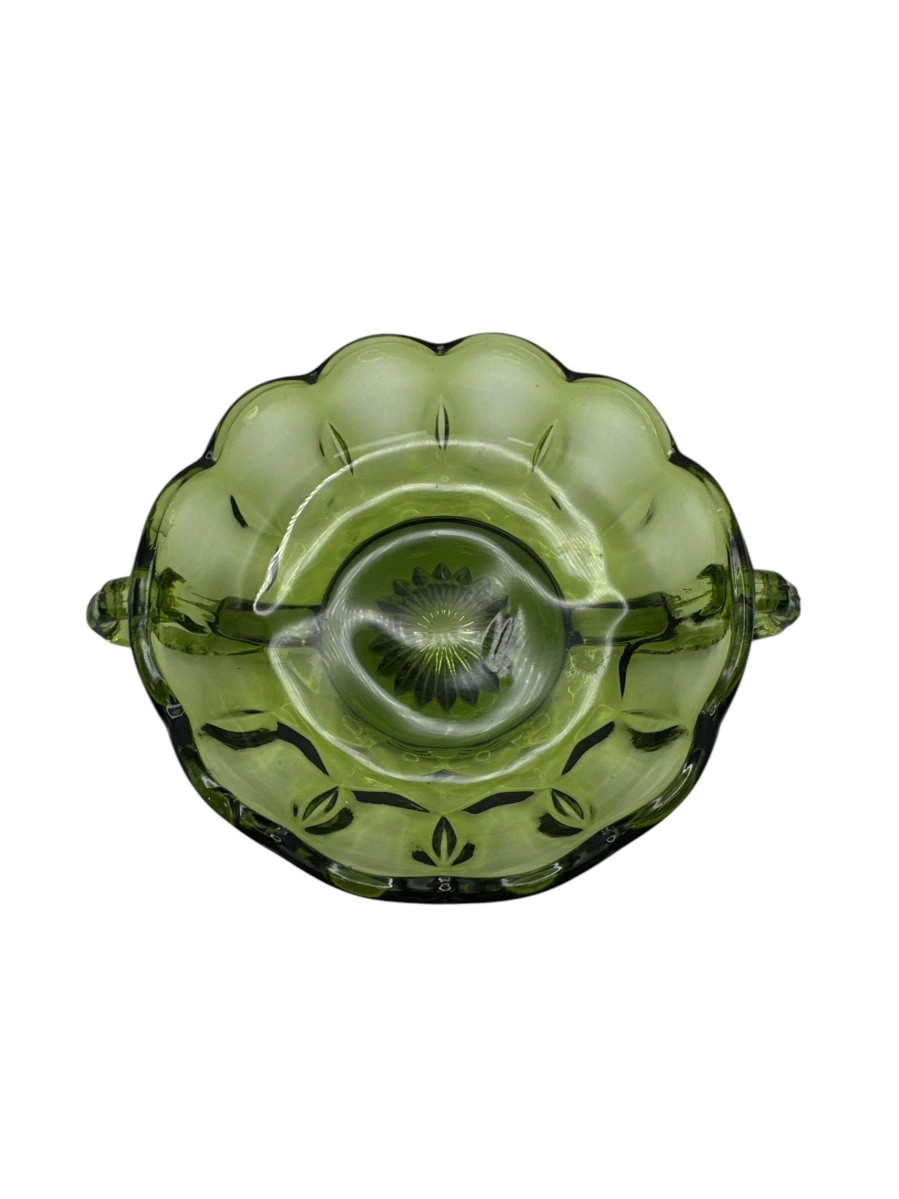 Expertly crafted by Anchor Hocking, this Vintage Bowl Dish boasts a stunning avocado green hue and a delicate, scalloped rim. Carefully pressed with pattern #1200, this 2-handled dish measures 17cm in length, 14cm in width, and 4cm in height.