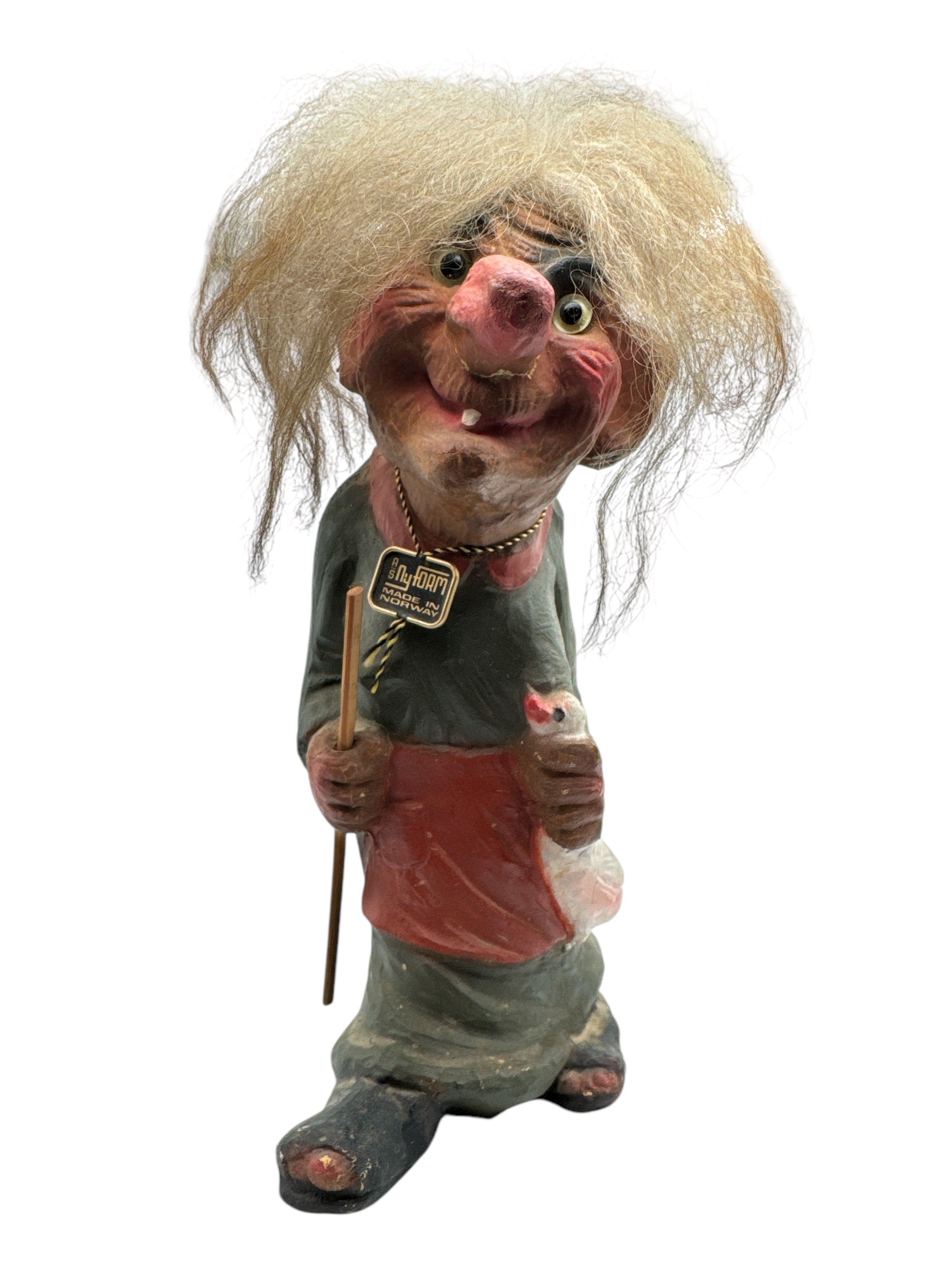 This Vintage AS Nyform Norway Troll Doll, specifically #114, is a rare and discontinued item, making it a prized possession for collectors. It was expertly crafted in Norway and comes with a walking stick, adding to its unique charm. Please take note that although it is in used condition, it has been repaired on the hand, which has been reflected in the price.