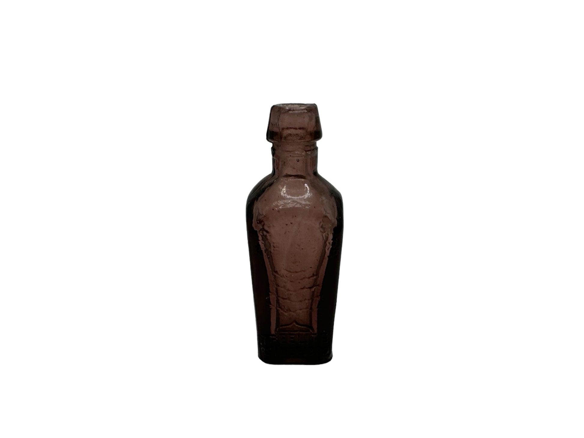 Indulge in the timeless elegance of Vintage Elixir's Tree of Life glass bottle, crafted in Taiwan since 1880 and adorned with amethyst accents. While there may be a small flaw on the bottom corner, it only adds to the rare and luxurious nature of this exquisite mini Wheaton bottle. Savor the nectar of health with every precious sip.