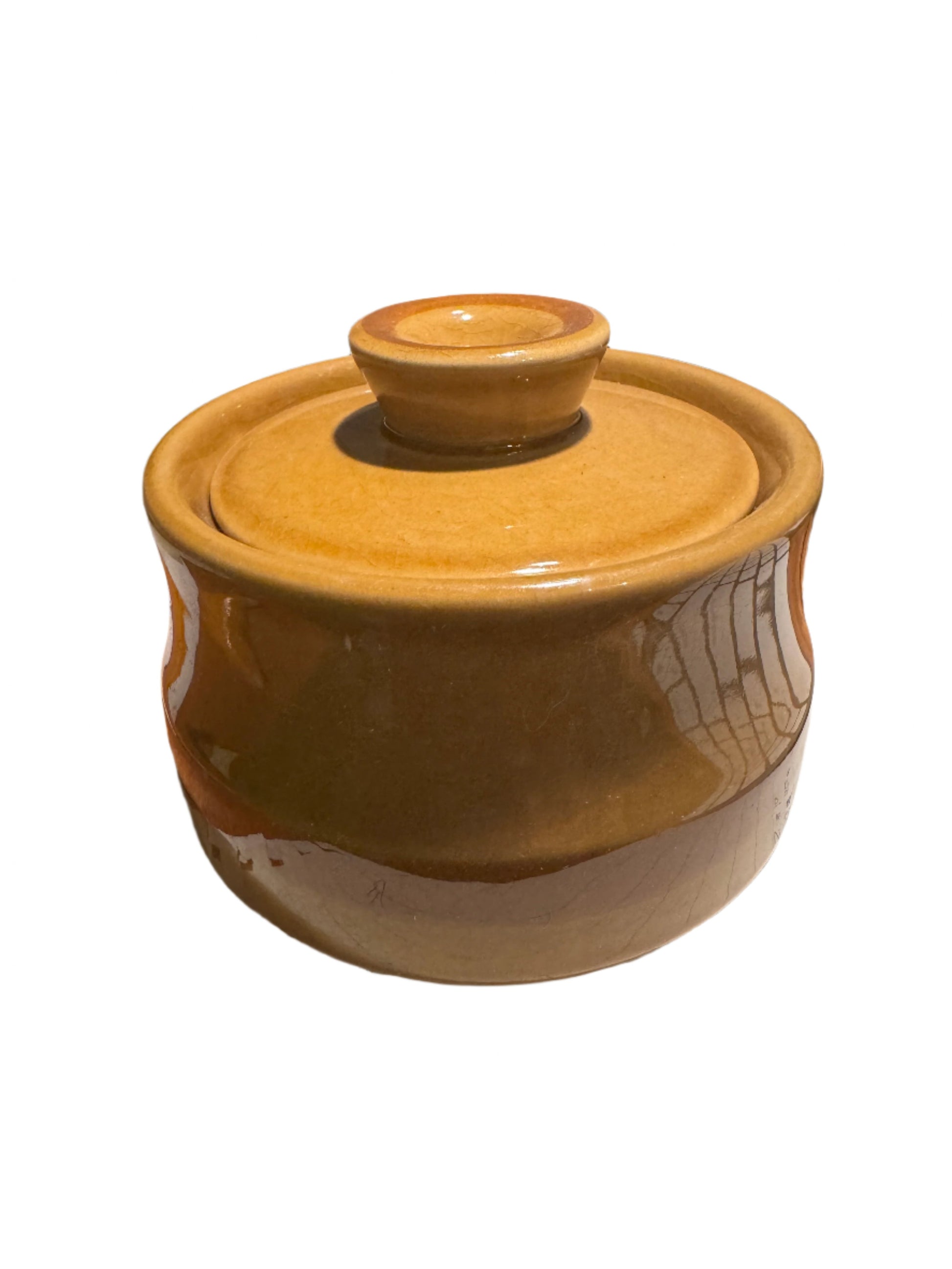 Crafted in Japan during the 1970s, this vintage Japanese bowl can be utilized as a sugar bowl or a jam bowl, featuring a charming brown and tan calypso pattern. Measuring 10 cm in length, 10 cm in width, and 8 cm in height, this versatile piece adds a touch of nostalgia to any kitchen.