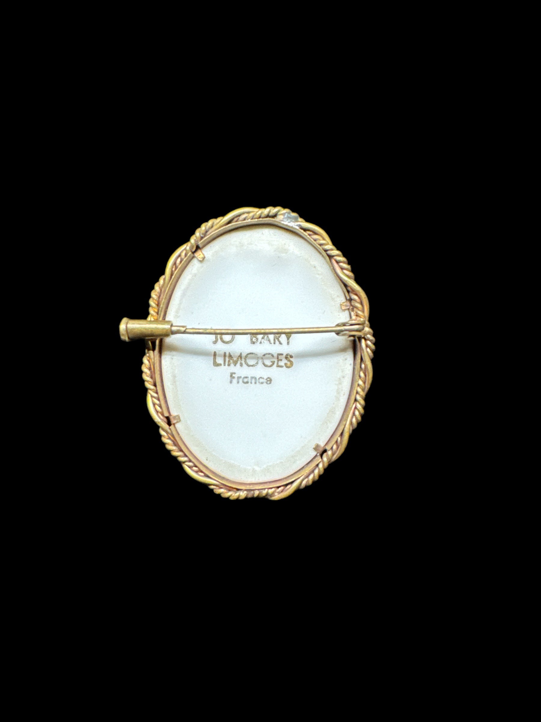 This exquisite Vintage 1940's Limoges brooch by Jo Bary features a delicate bouquet of white, blue, yellow, orange, and pink flowers on a porcelain base, showcasing the intricate craftsmanship of the maker. Measuring 3.75 cm in length, 1 cm in width, and 4.5 cm in height, it is a stunning piece in good used condition, signed by the artisan.