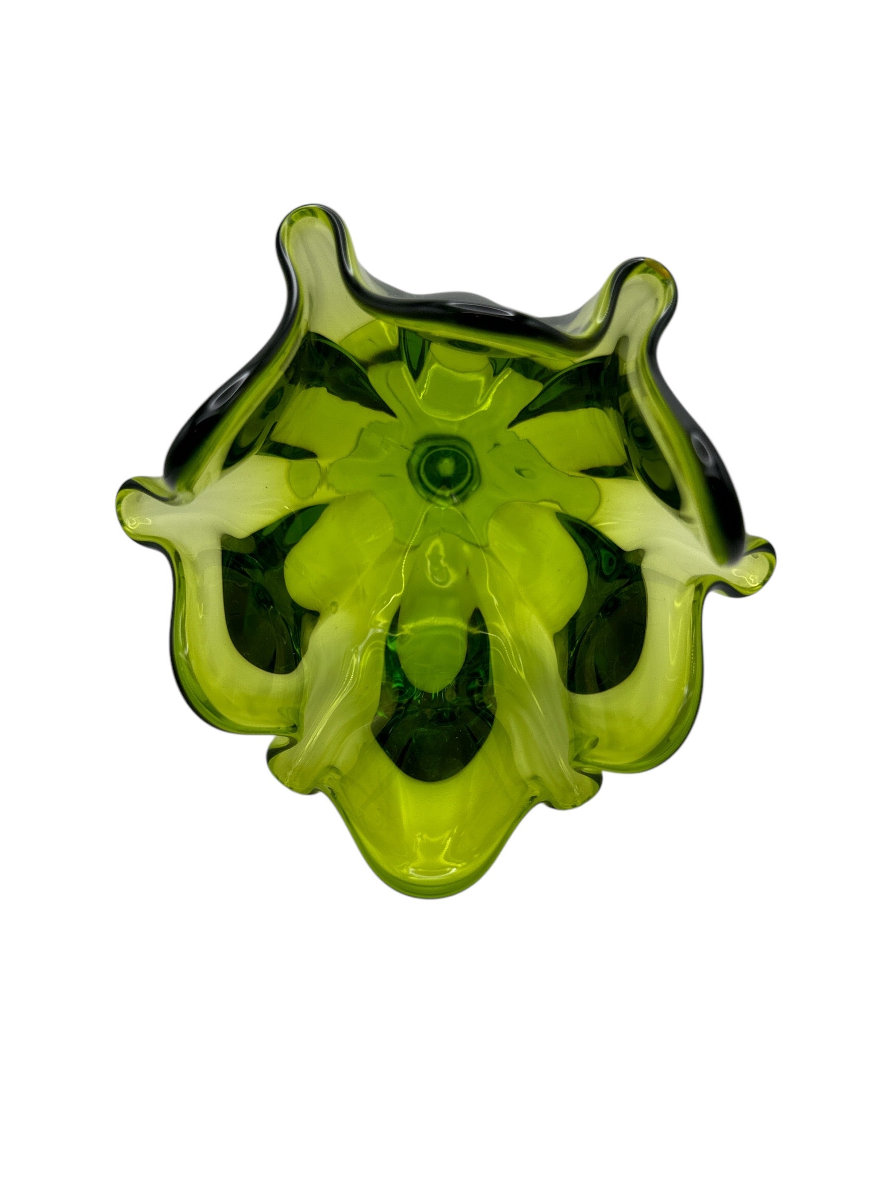 Experience the beauty and craftsmanship of this exquisite Vintage Mid Century Viking Glass Vase. With its elegant avocado green color and intricate handkerchief design featuring 6 delicate petals, this stunning 6 point pedestal vase is a true collector's item. Measuring 12cm in length, 12cm in width, and 18cm in height, it is free of any chips or cracks, ensuring its lasting quality and value.